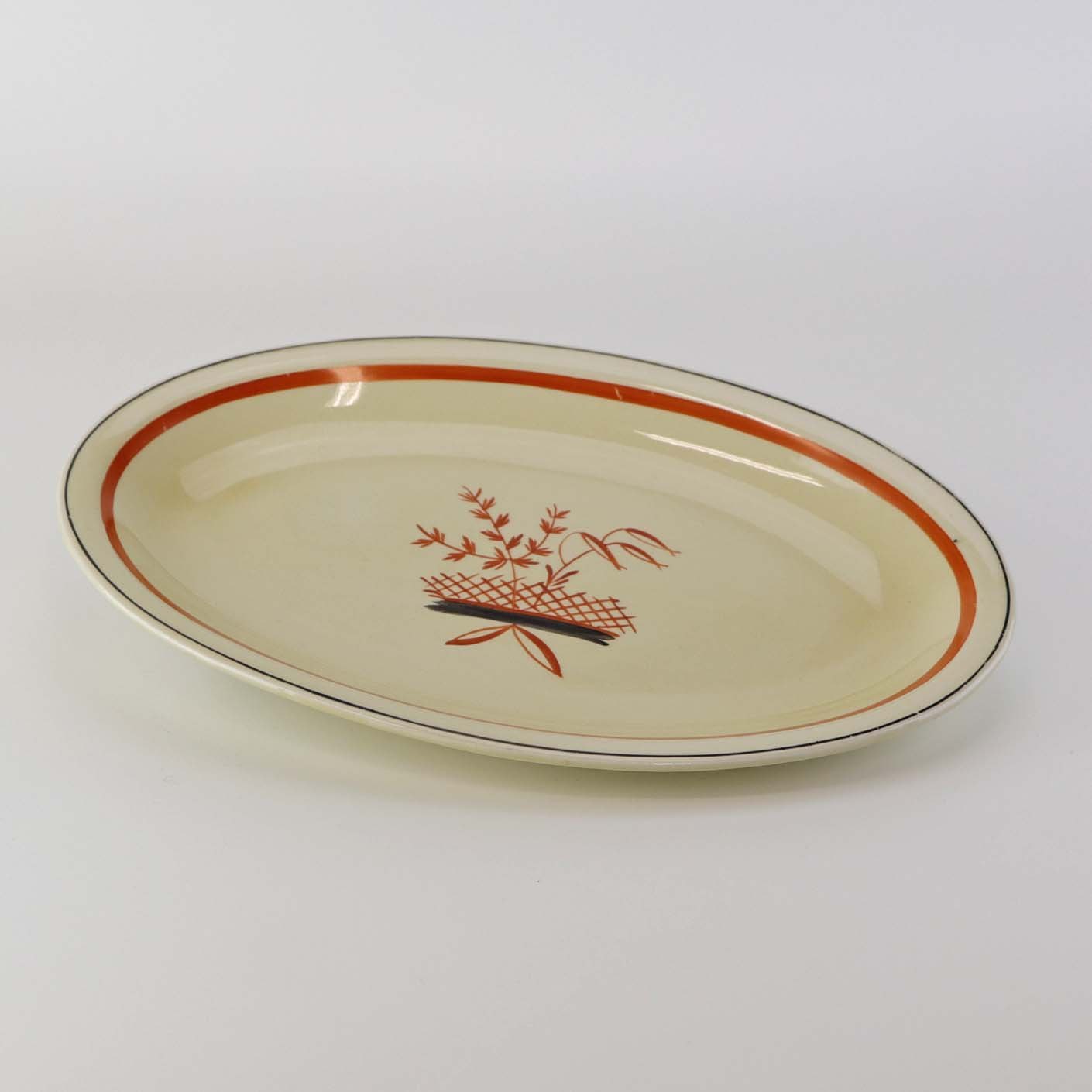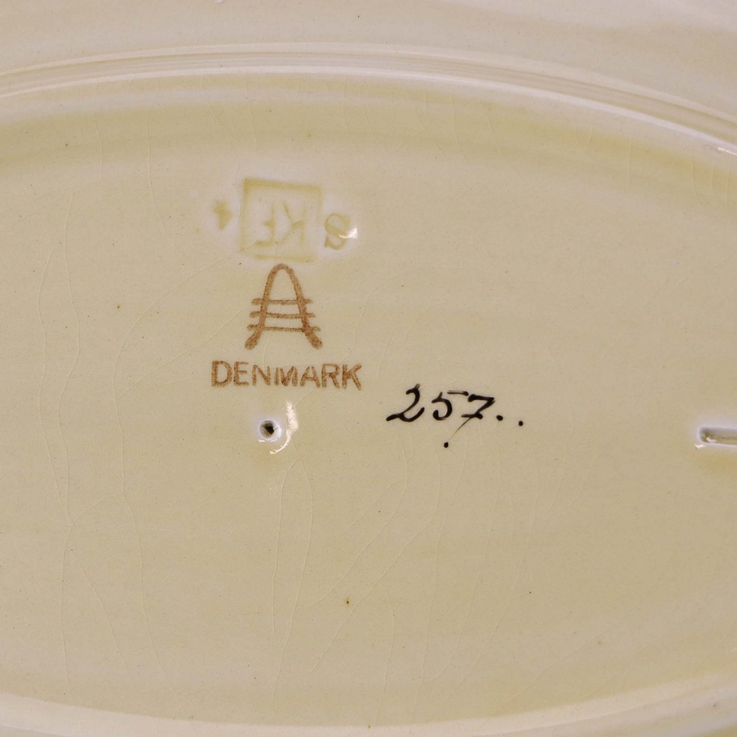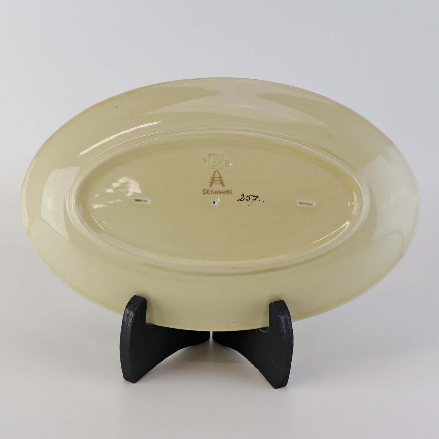 Mindre ovalt serveringsfad i fajance fra stellet Mariager. Nr. 257
