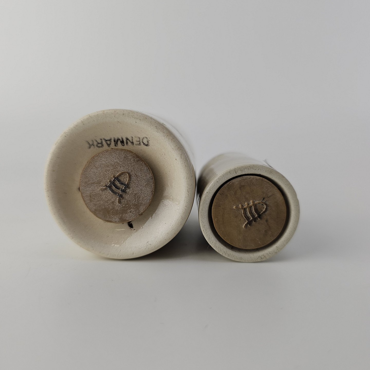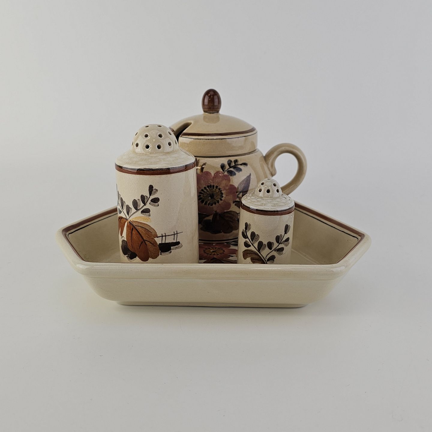 Plat de menage med peberbøsse, saltbøsse og sennepskrukke i fajance fra stellet Knud
