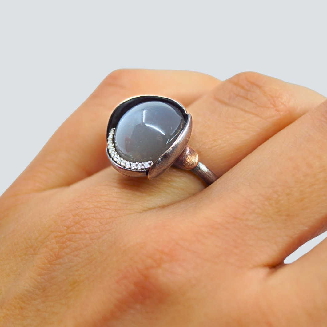 Charlotte Lynggaard for Ole Lynggaard; Lotus ring nr. 3 i sølv, med månesten og 13 brillantslebne diamanter. I alt 0,08 ct. TW. VS.