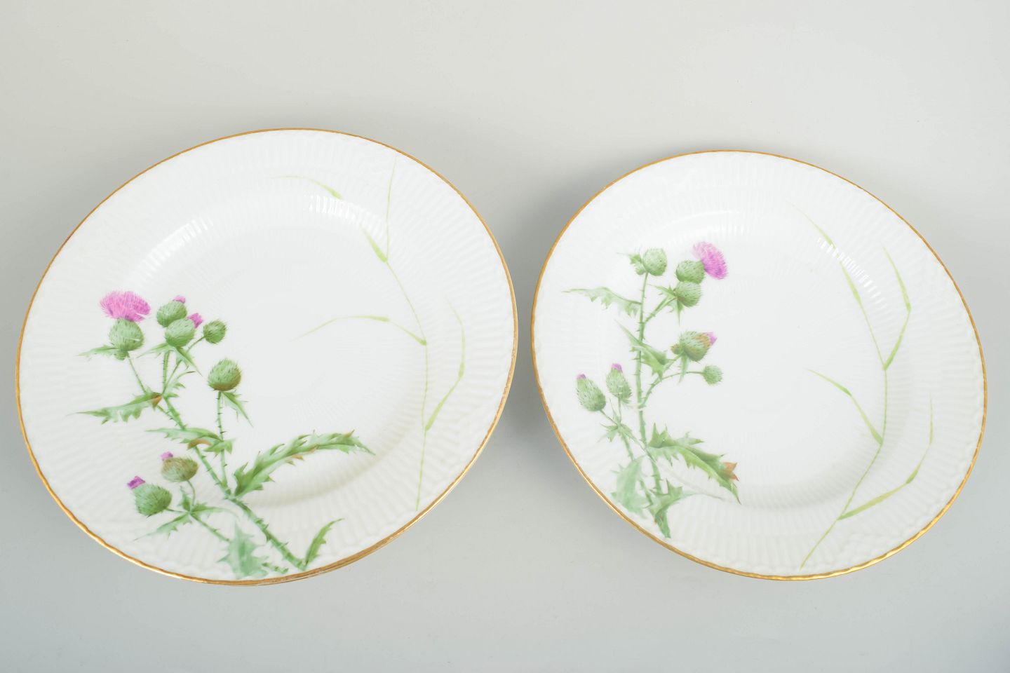 Sæt af seks middagstallerkener i håndmalet porcelæn fra Tidsel serien. Dekoreret med naturalistisk tidselmotiv i grønne og rosa nuancer samt forgyldt kant. Første sortering.