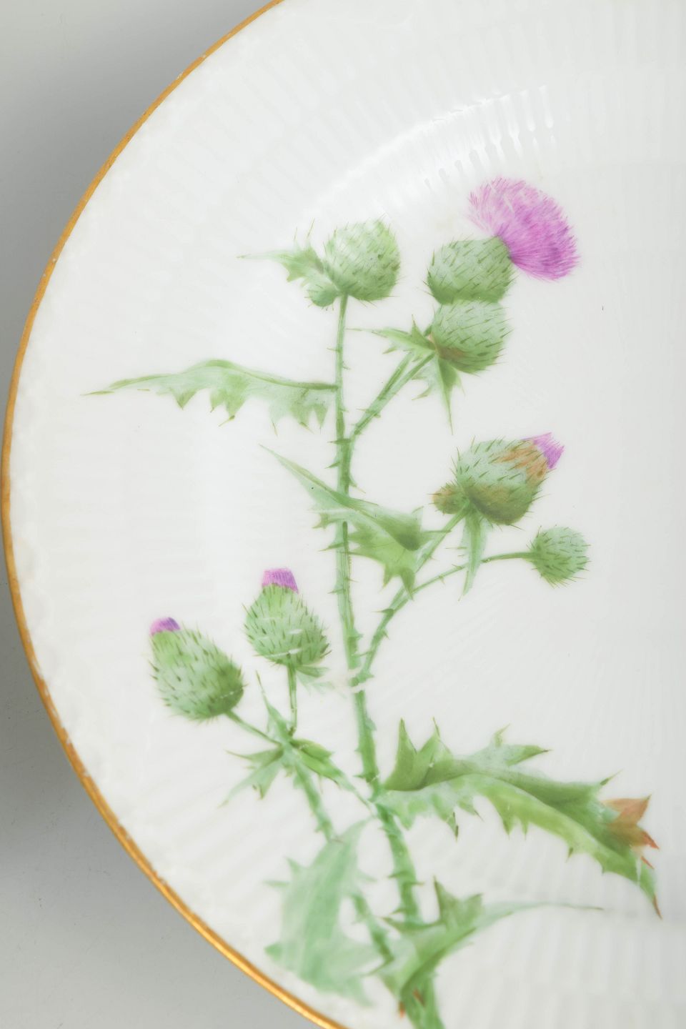 Royal Copenhagen blev grundlagt i 1775 i København under kongelig bevilling. Fabrikken er internationalt anerkendt for sit håndmalede porcelæn og høje kunstneriske kvalitet. Omkring år 1900 producerede fabrikken en række naturalistiske dekorationer, herunder Tidsel, som er kendetegnet ved botanisk præcision og fine forgyldte detaljer.