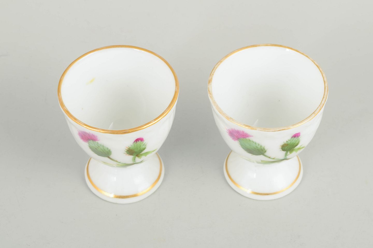 To æggebægre i håndmalet porcelæn med motiv fra Tidsel serien. Dekoreret med tidselblomst i grønne og rosa nuancer samt forgyldt kant. Første sortering.