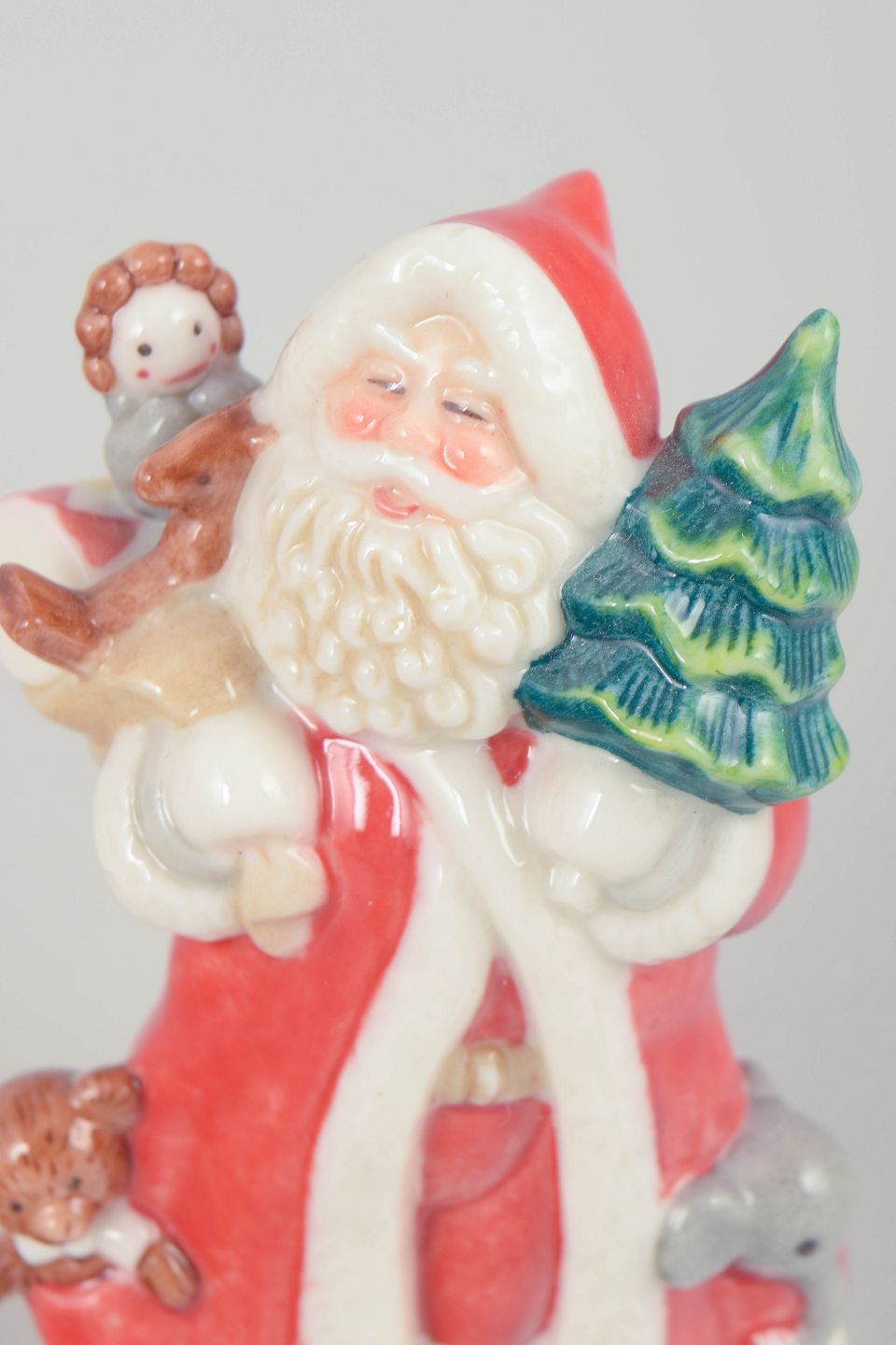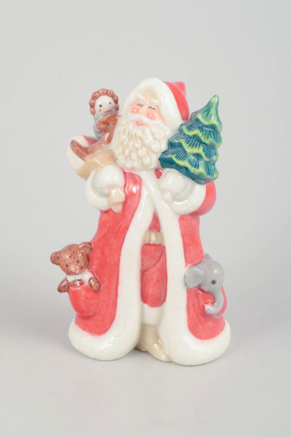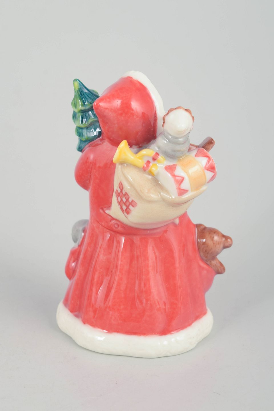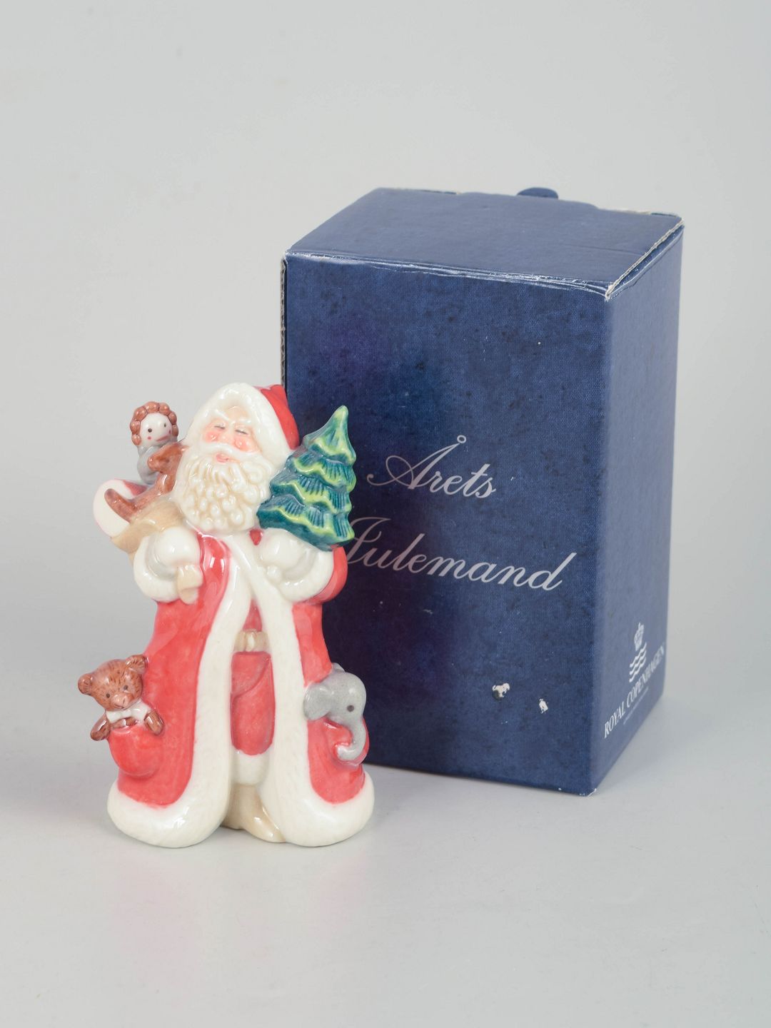 Dekorativ julemand figur i håndmalet porcelæn fra 2002, udført med gavesæk over skulderen. Figuren er detaljeret modelleret med klassisk rød dragt, hvid pelskant og sort bælte. Første sortering. Leveres med original æske.