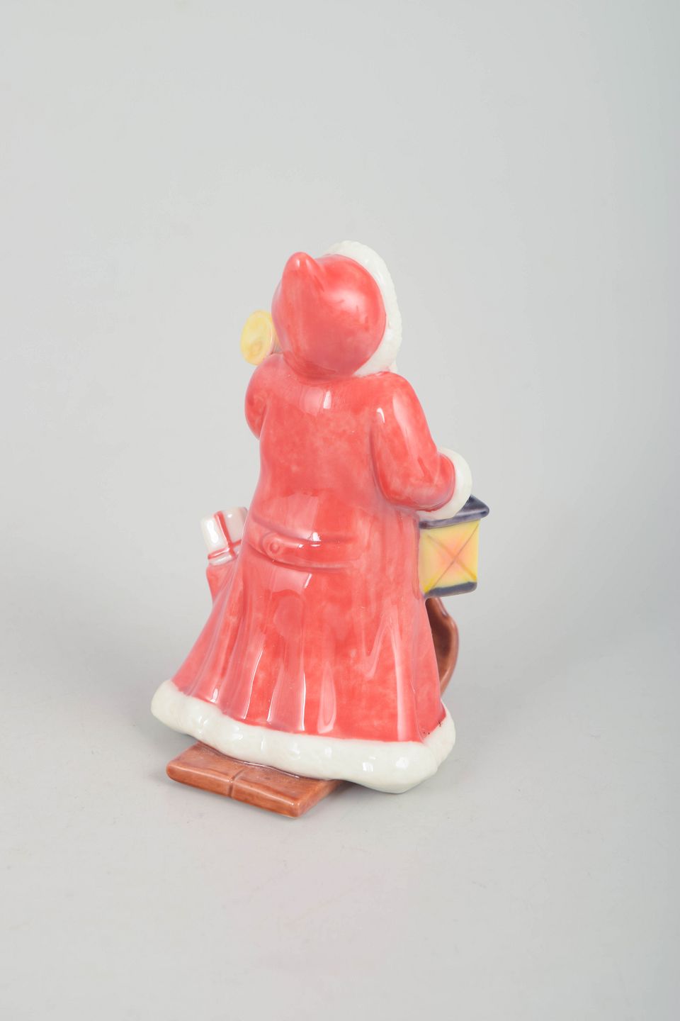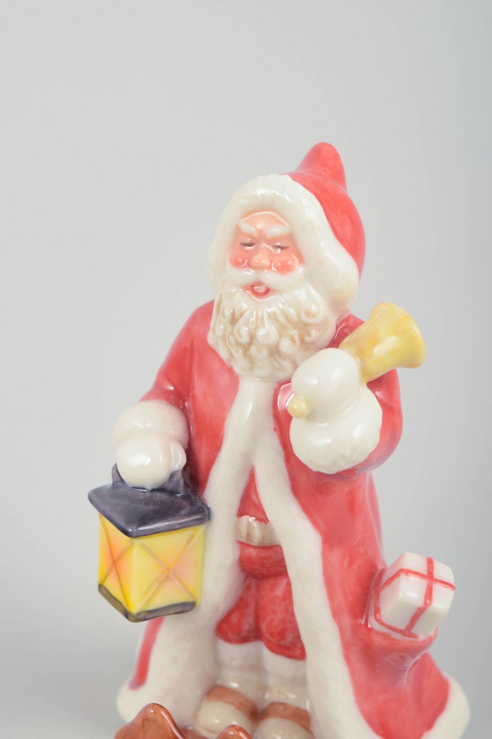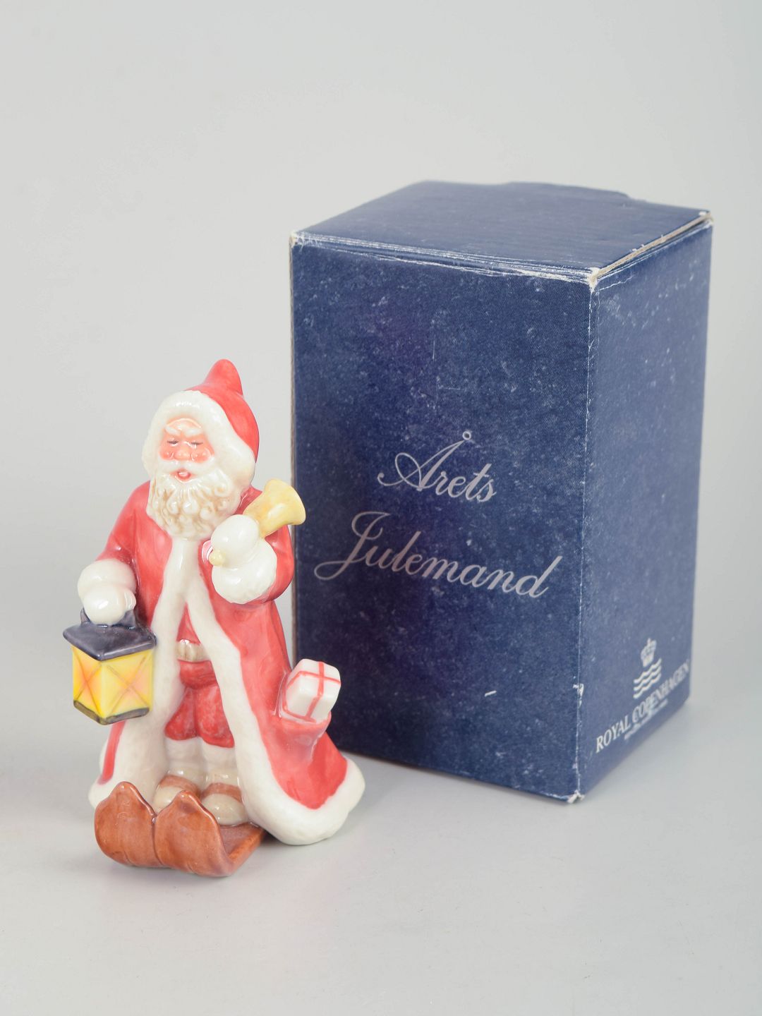 Dekorativ julemand figur i håndmalet porcelæn fra 2001, udført med lanterne og gavesæk. Figuren fremstår detaljeret modelleret med klassisk rød kappe og hvid pelskant. Leveres med original æske. Første sortering.
