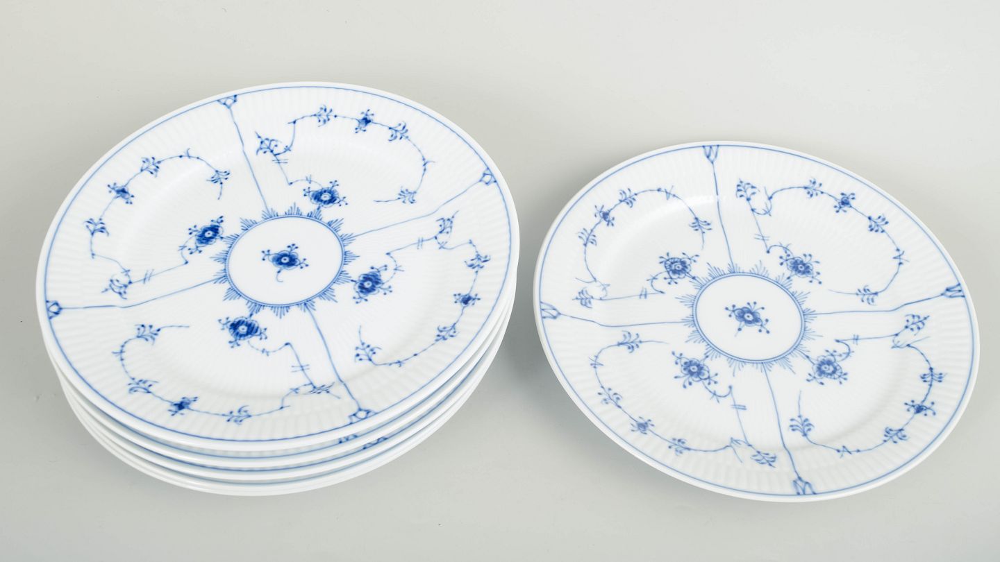 Text zugänglich auf Dänische: Royal Copenhagen Musselmalet Riflet, sæt af seks middagstallerkener.