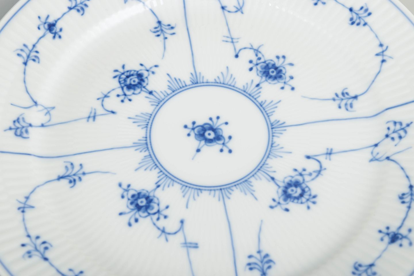 Sæt af 6 middagstallerkener i hvidglaseret porcelæn med håndmalet blå underglasurdekoration i serien Musselmalet Riflet, model 625. 1. sortering.