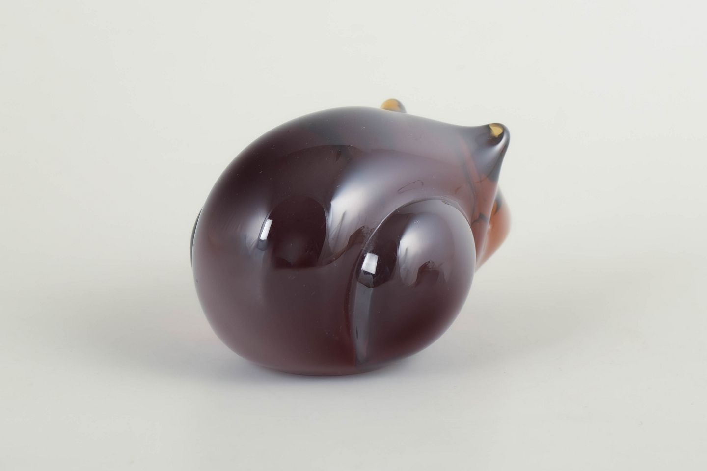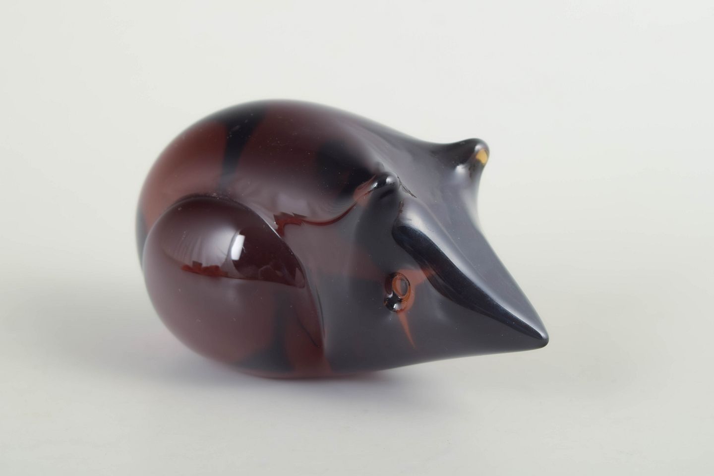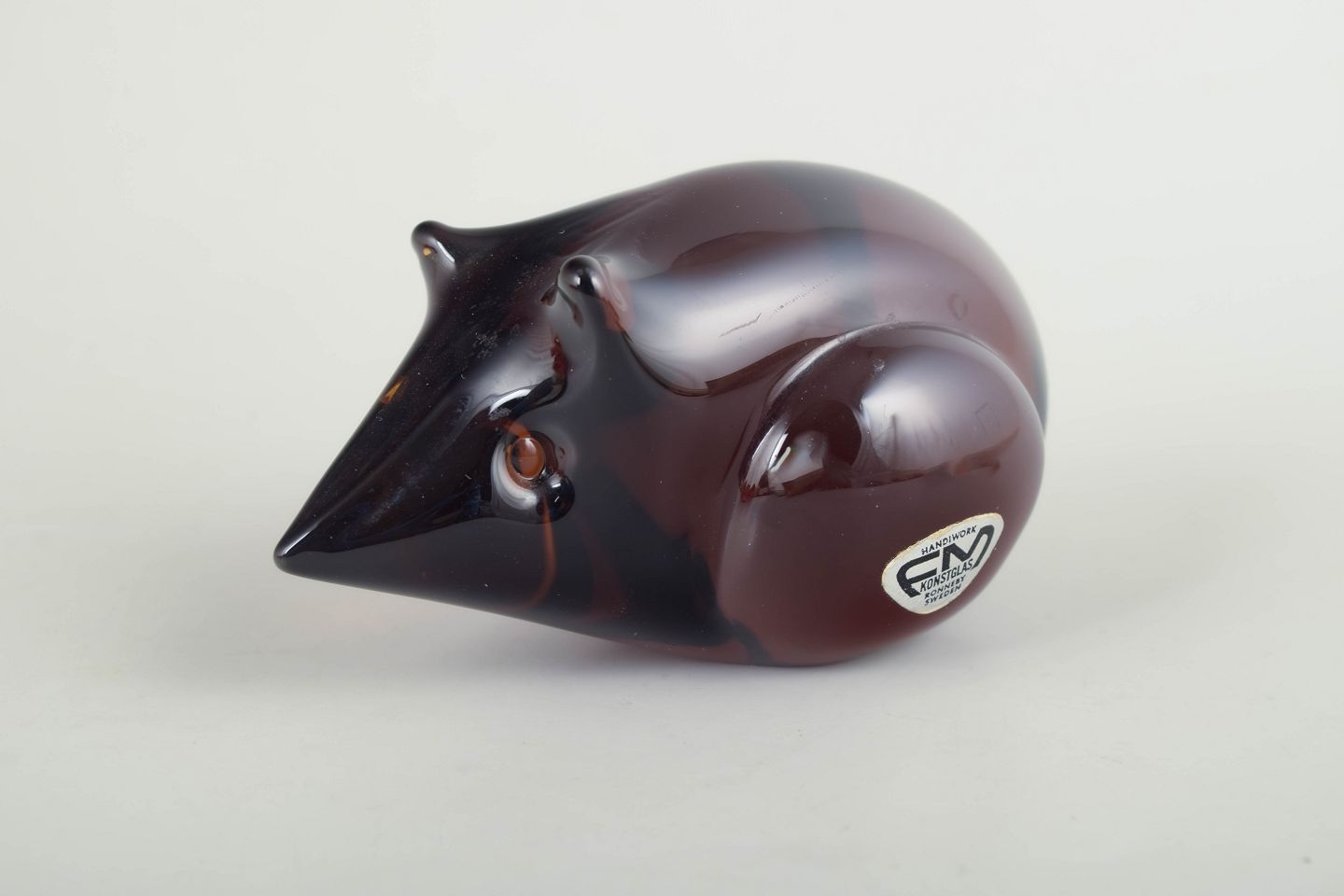 Dekorativ mus i massivt kunstglas med afrundet korpus i dybe rødbrune nuancer og kontrasterende mørkere hoved. Udført med glat, poleret overflade og stiliserede træk. Med originalt mærkat fra FM Konstglas, Ronneby.