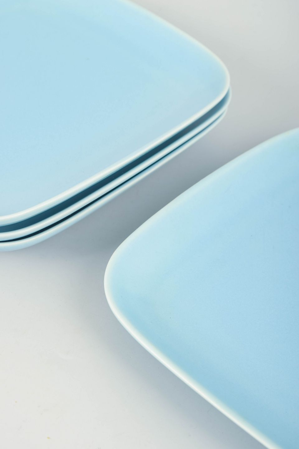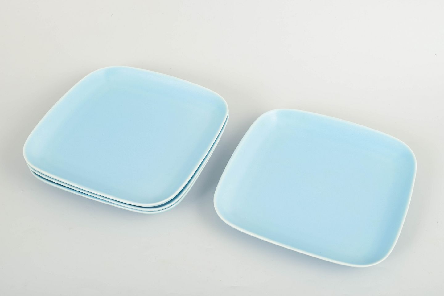 Kvadratiske middagstallerkener i stentøj med afrundede hjørner og ensartet turkis glasur.