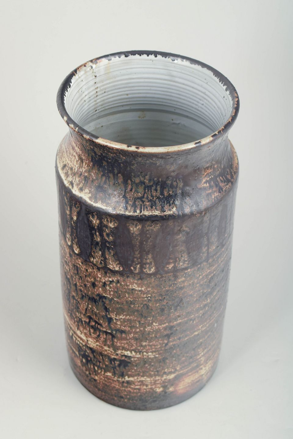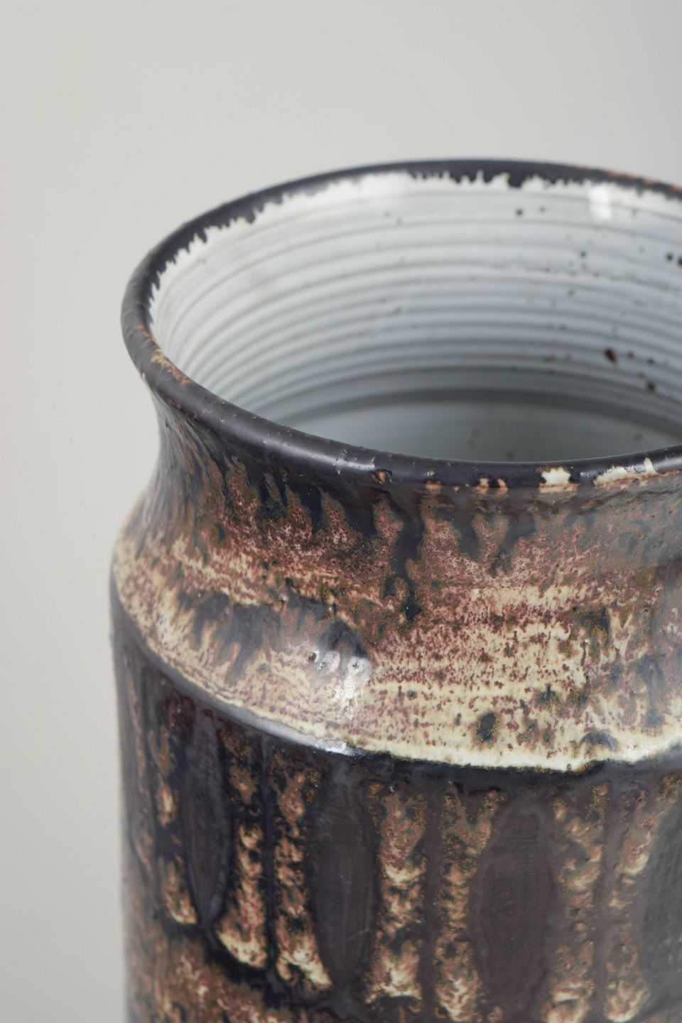 Cylinderformet vase i stentøj med let indsnævret hals og markeret rand. Overfladen er udført i dybe brune og sorte nuancer med metallisk skær og markante lodrette og horisontale glasurspor.