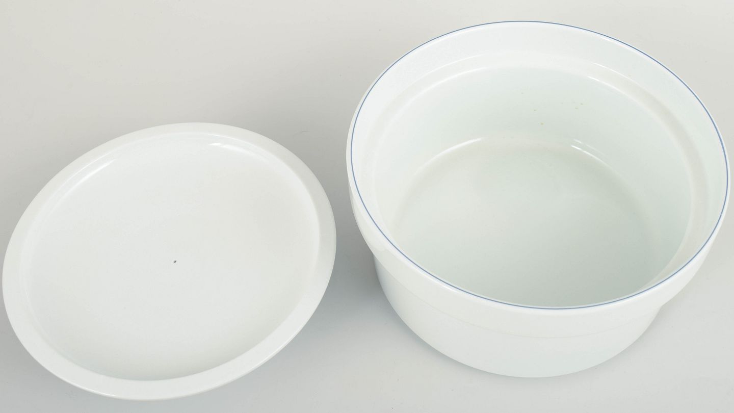 Lågterrin model 174 i hvid fajance med enkel blå rand langs låg og kant. En del af Blåkant-serien med sit stringente og funktionelle formsprog. Fremstillet 1992–1999. 1. sortering.