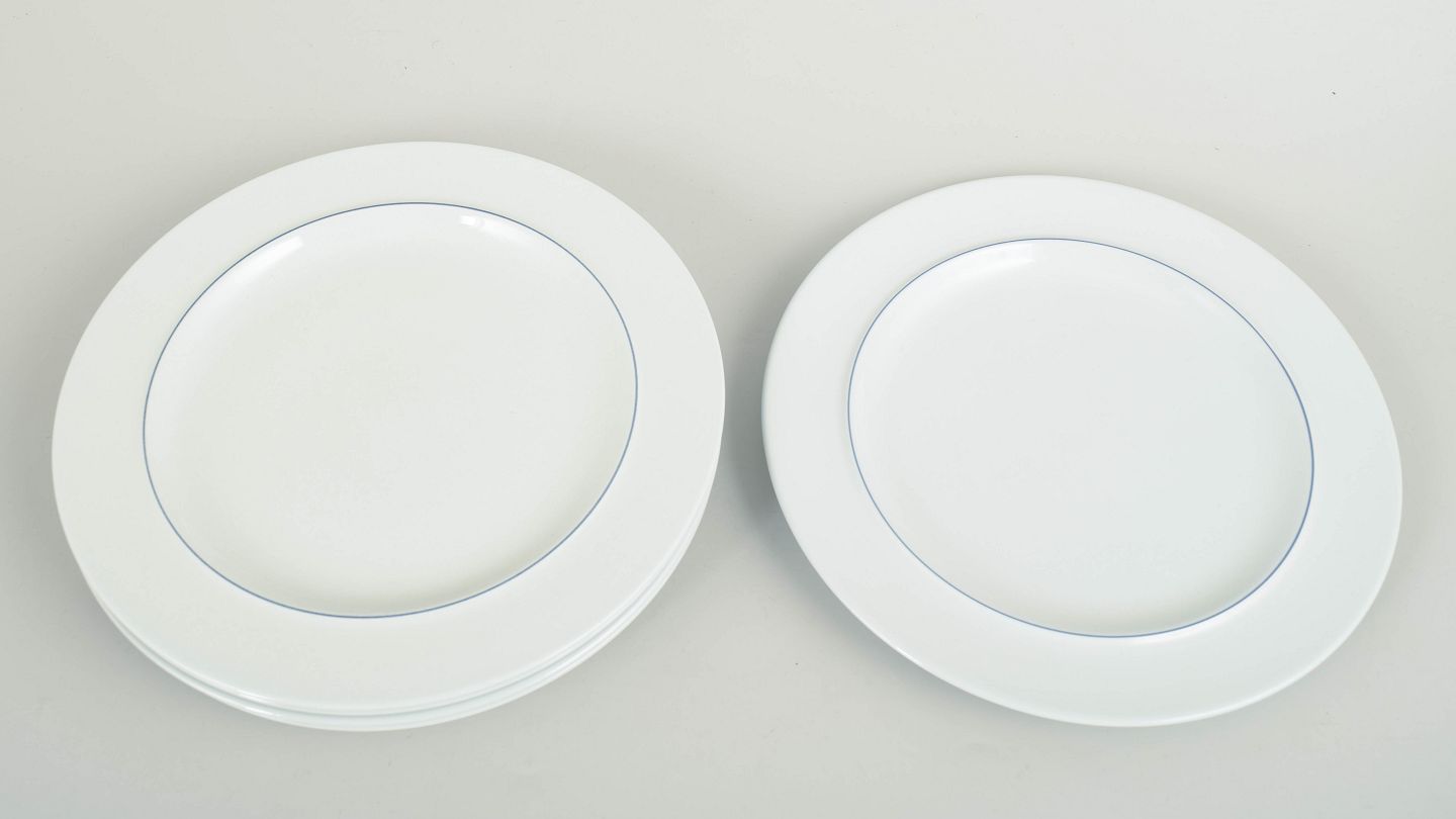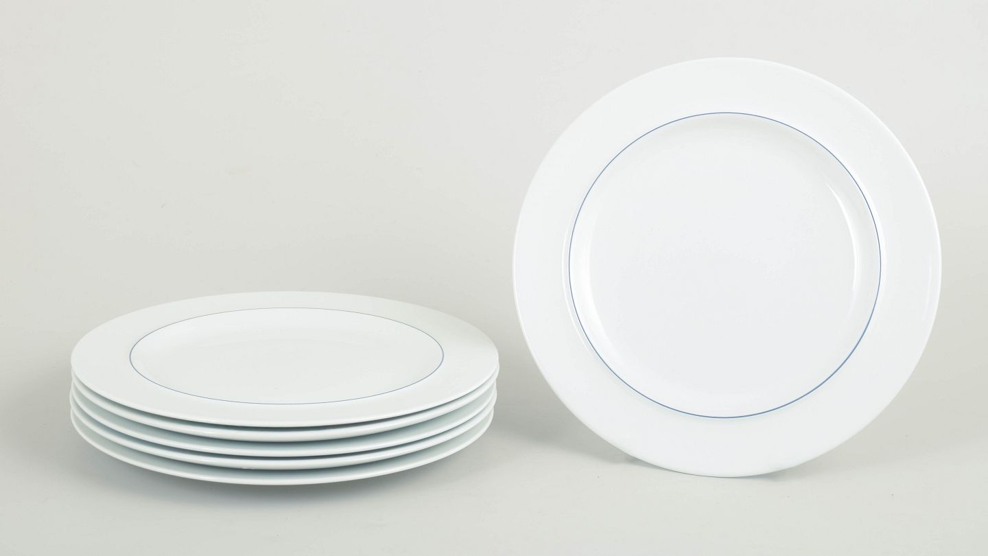 Seks runde tallerkener model 621 i hvid fajance med enkel blå rand langs fanen. En del af Blåkant-serien med sit stringente og funktionelle formsprog. Fremstillet 1992–1999. 1. sortering.