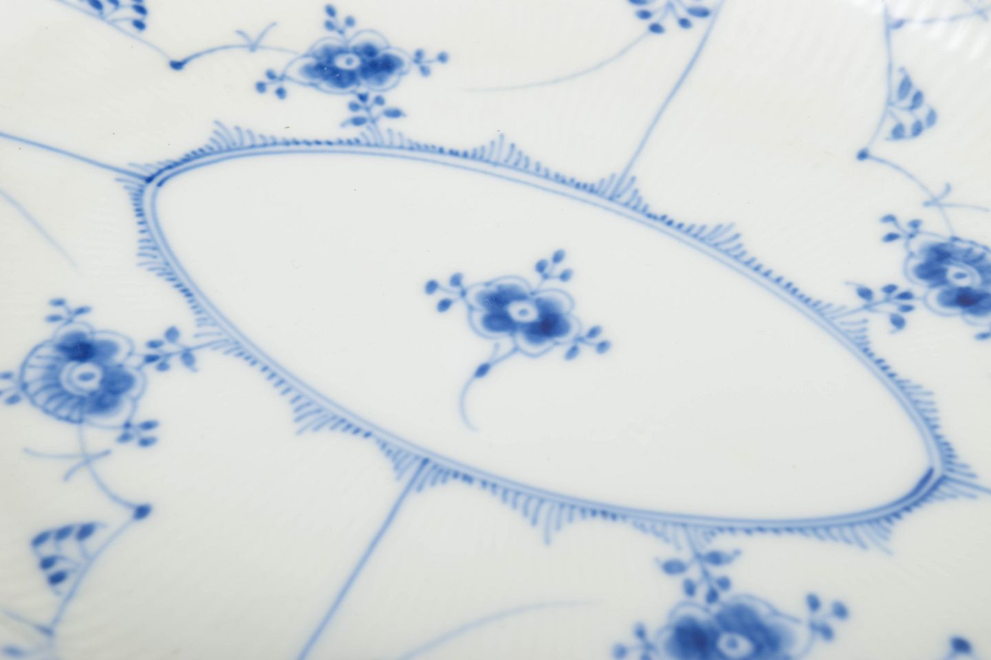 Ovalt fad i håndmalet porcelæn fra Musselmalet Halvblonde med klassisk underglasurdekoration i koboltblå, riflede felter og karakteristisk blondekant. Model 1/628. Første sortering. Fremstillet 1964.