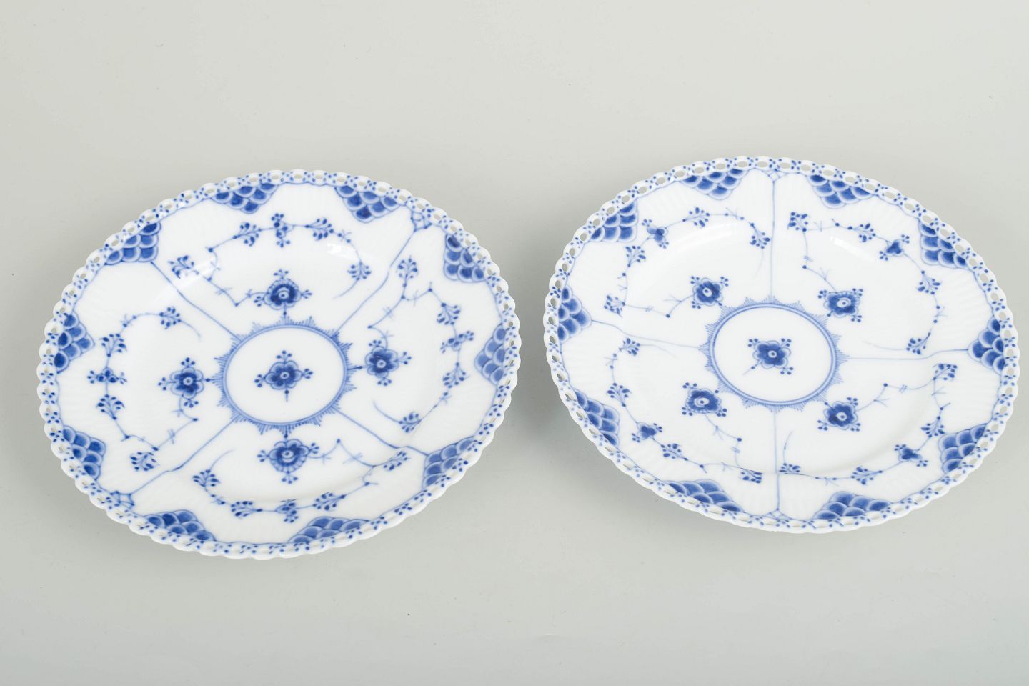 Sæt af to frokosttallerkener i håndmalet porcelæn fra Musselmalet Helblonde med klassisk underglasurdekoration i koboltblå og gennembrudt blondekant. Model 1/1086. Første sortering. Den ene fremstillet i 1920’erne, den anden i 1890’erne.