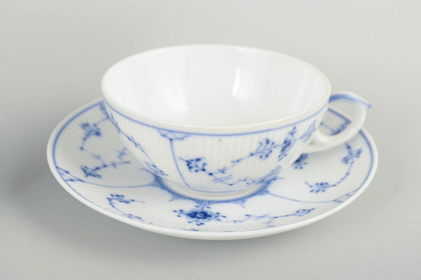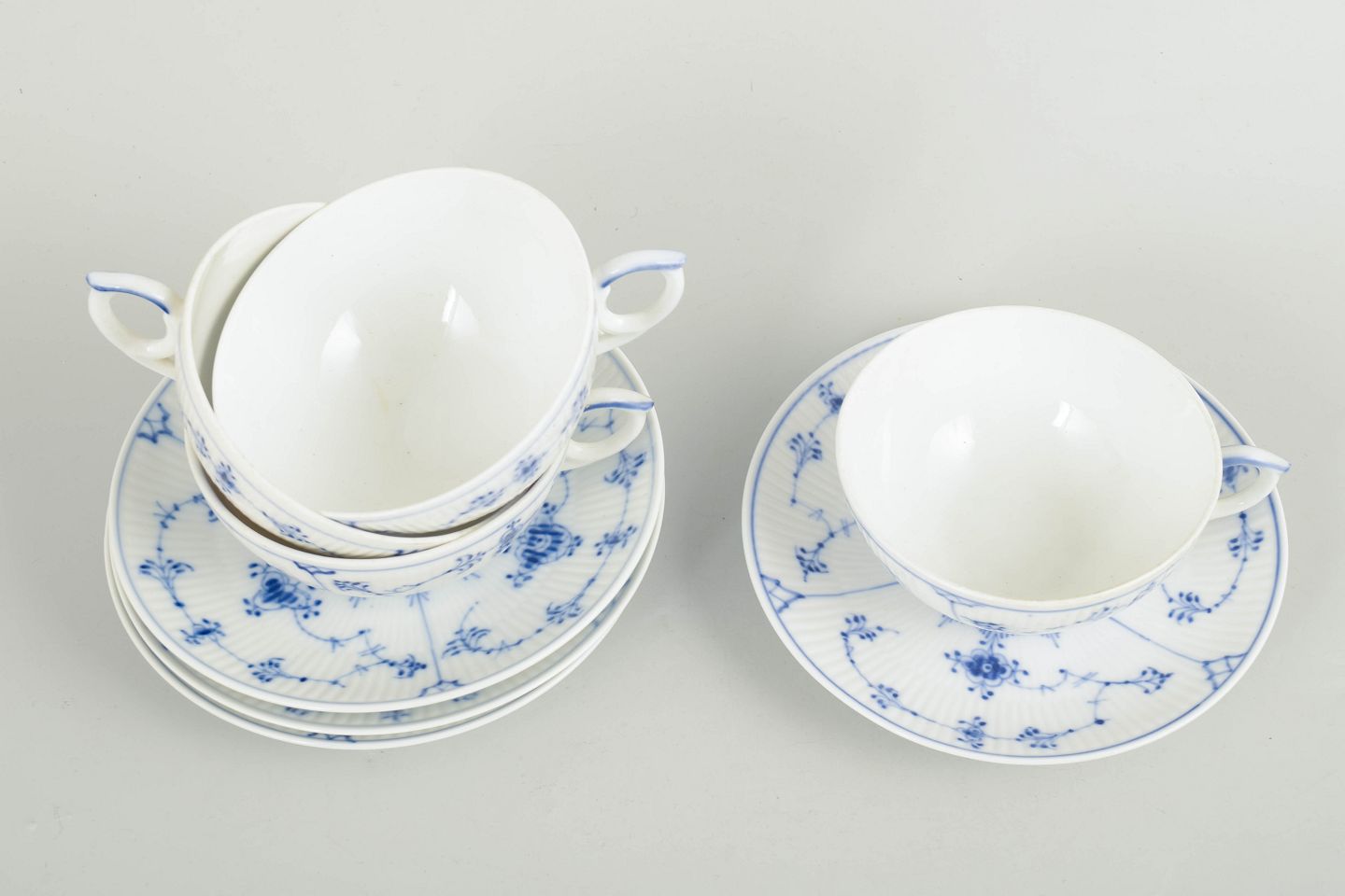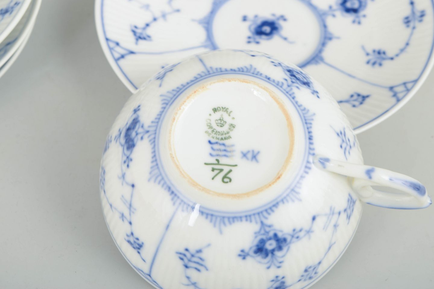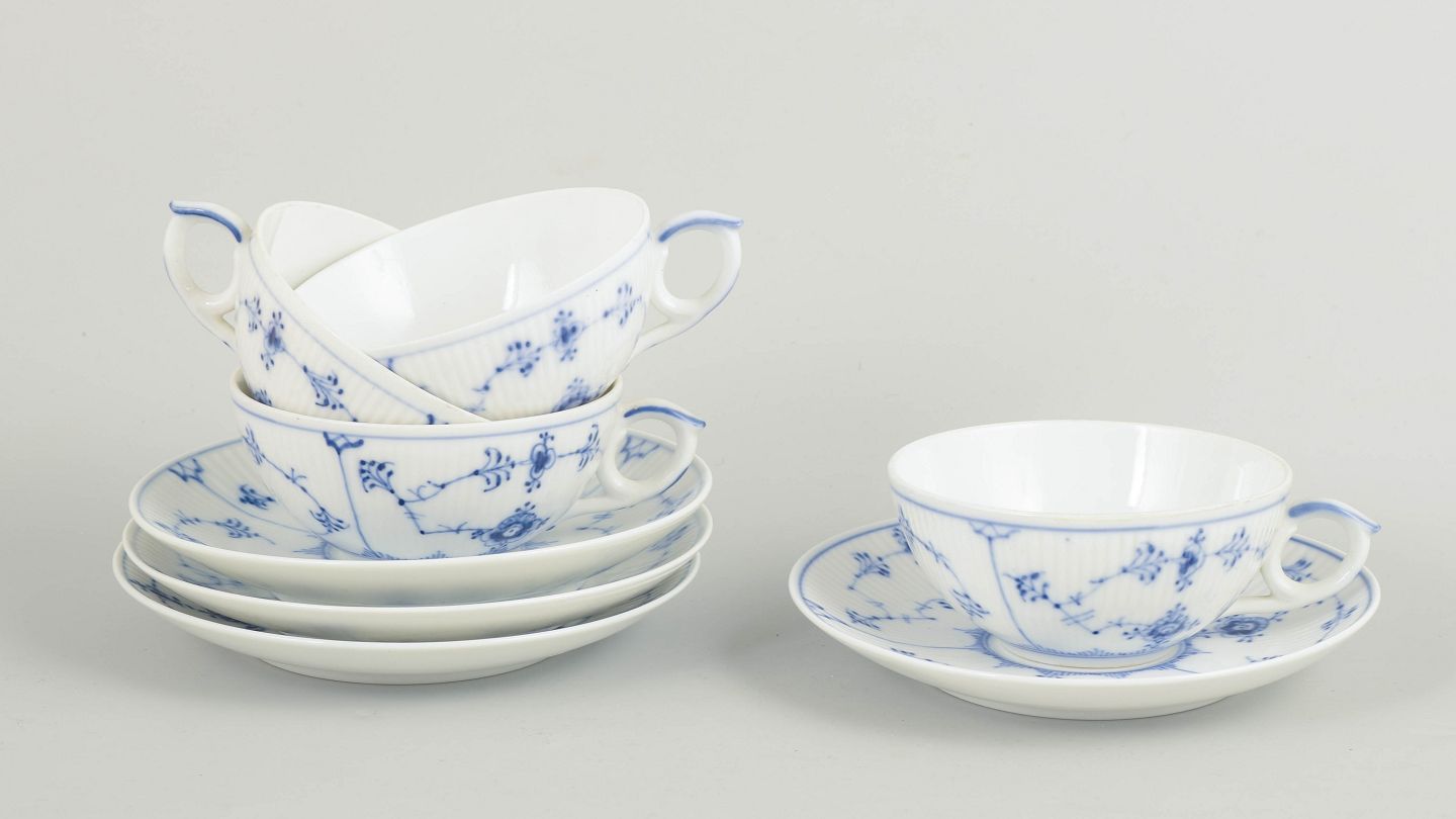 Sæt af fire tekopper i håndmalet porcelæn fra Musselmalet Riflet med klassisk underglasurdekoration i koboltblå. Model 1/76. Nogle dele er første sortering, andre annulleret med én eller to indridsede streger under bunden.