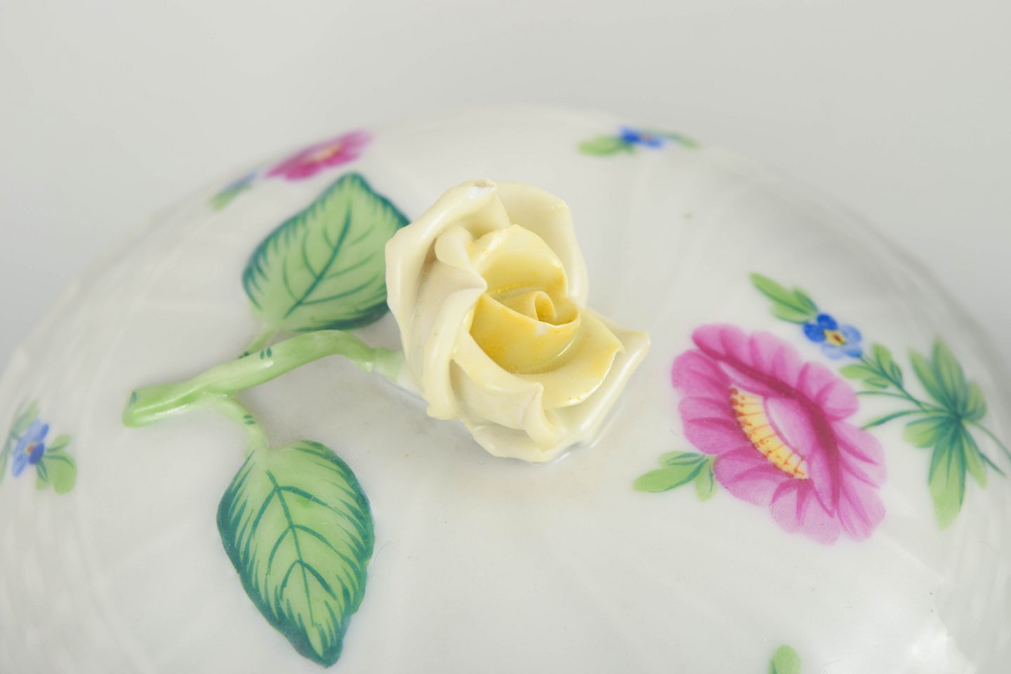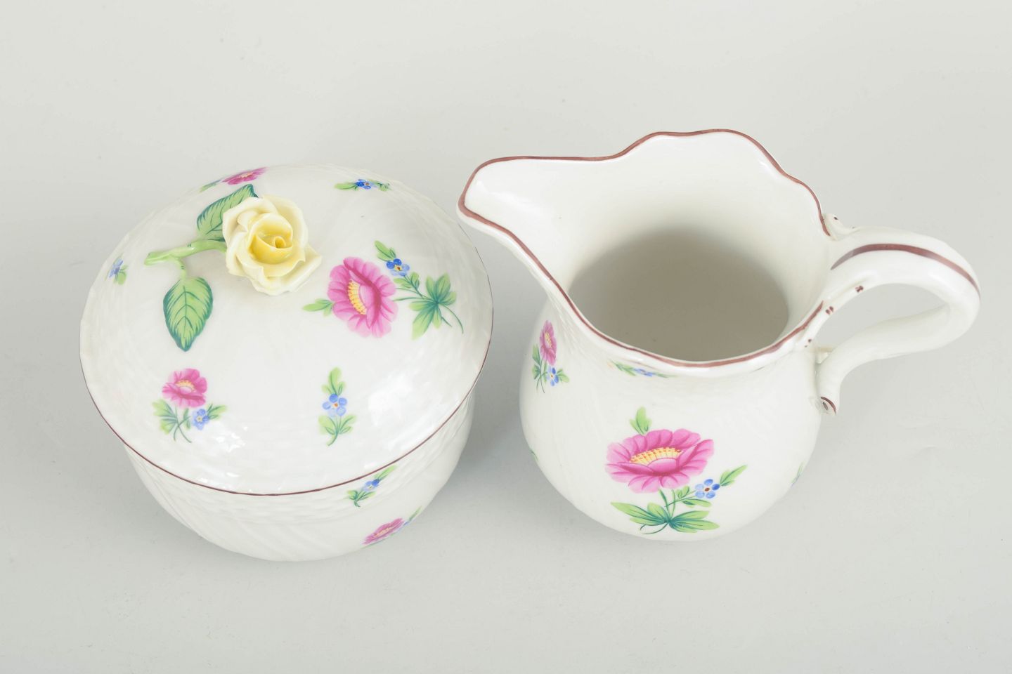 Sæt bestående af sukkerskål med låg og flødekande i håndmalet porcelæn fra Herend. Dekoreret med naturalistiske blomster i rosa og blå nuancer samt fine grønne blade. Låget afsluttes med knop formet som en gul rose. Fabriksmærket i blåt under bunden.