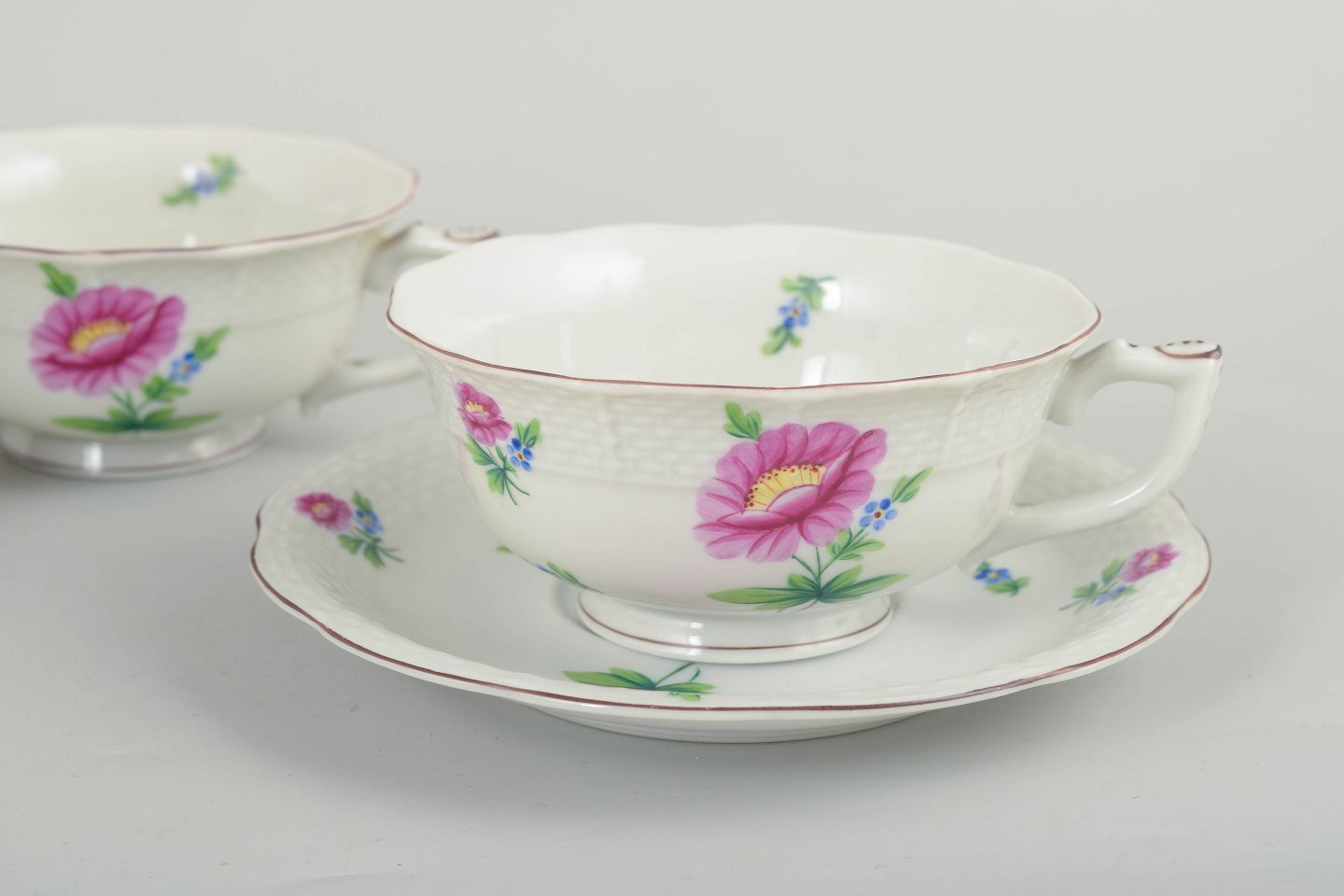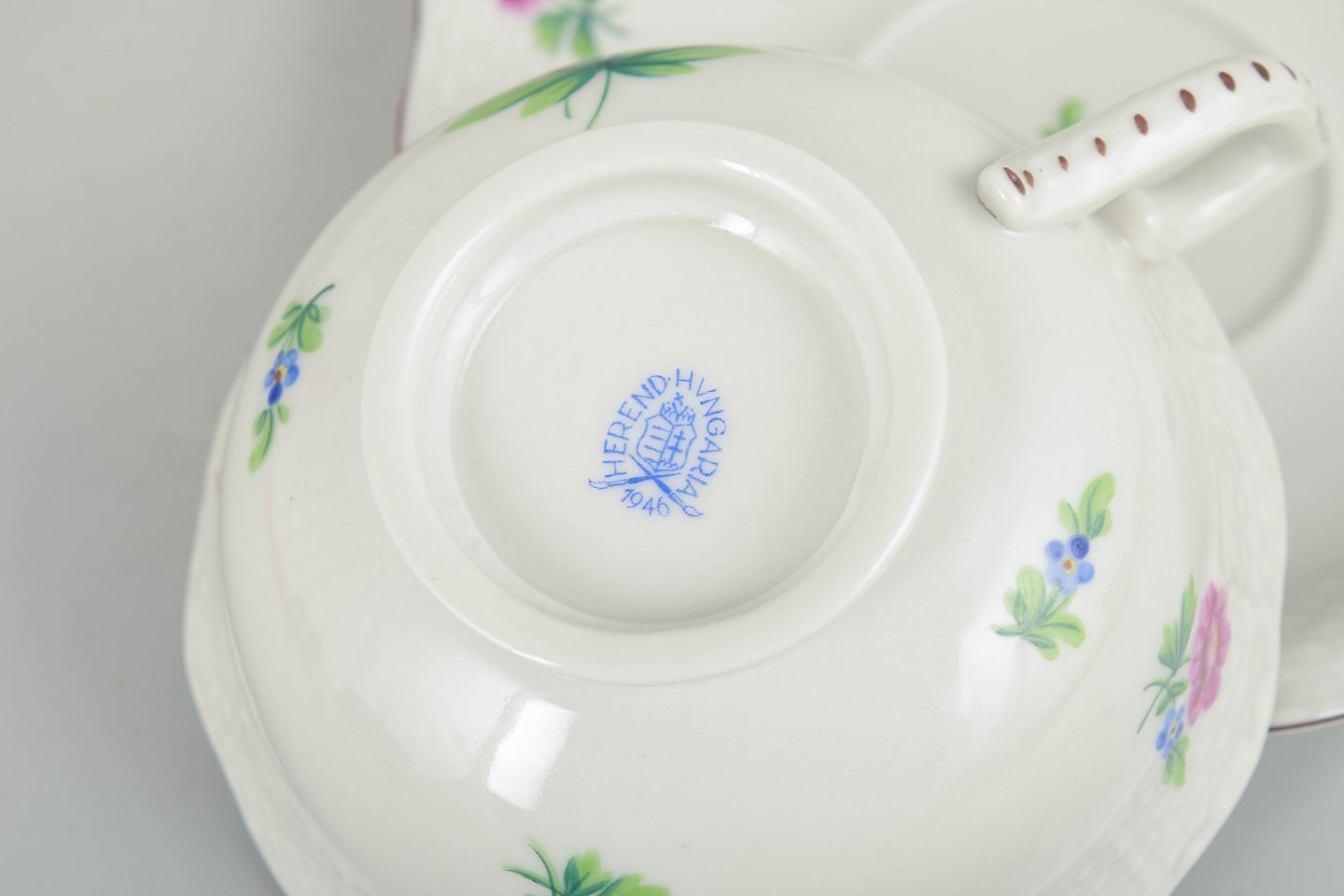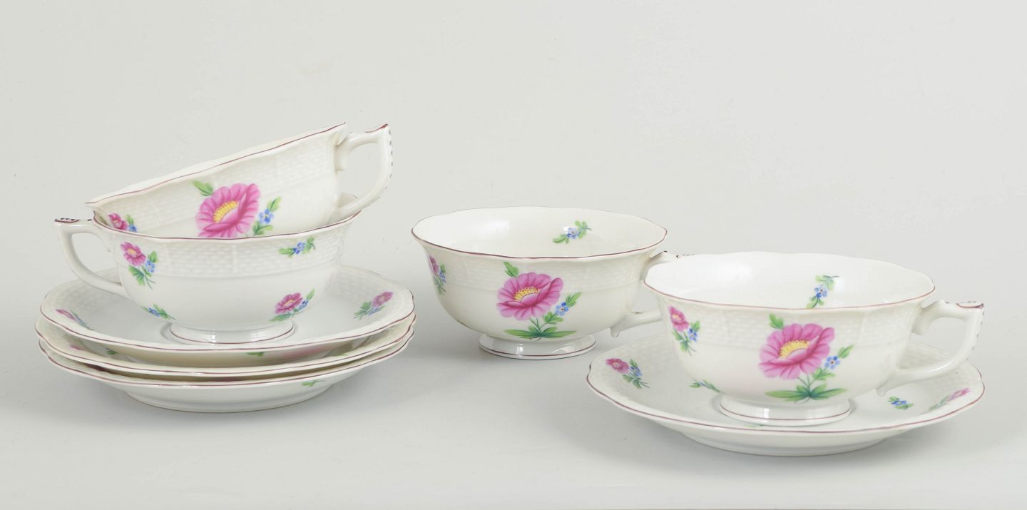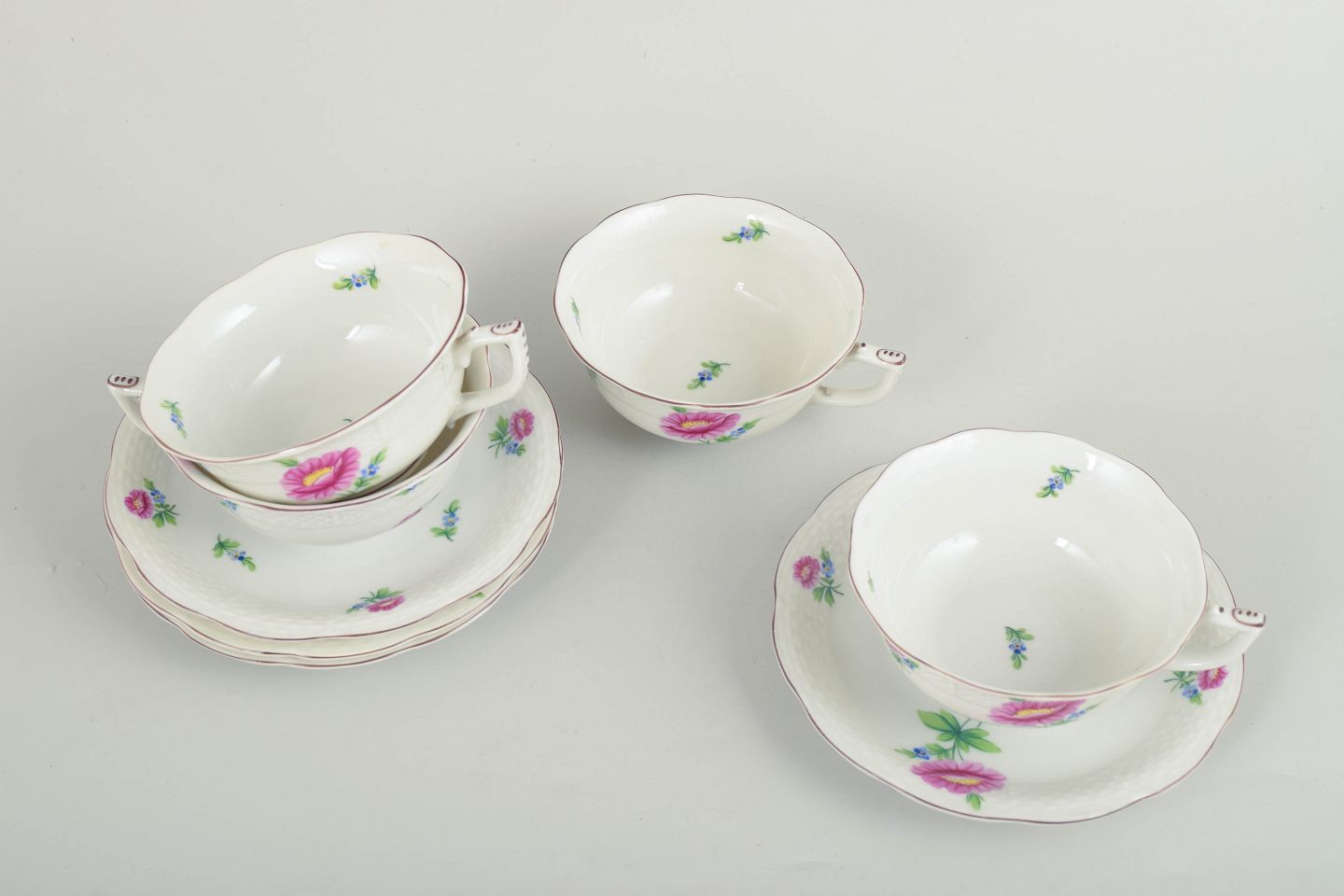 Sæt bestående af fire håndmalede tekopper med matchende underkopper i porcelæn fra Herend. Dekoreret med naturalistiske blomster i rosa og blå nuancer samt fine grønne blade. Fabriksmærket i blåt under bunden.