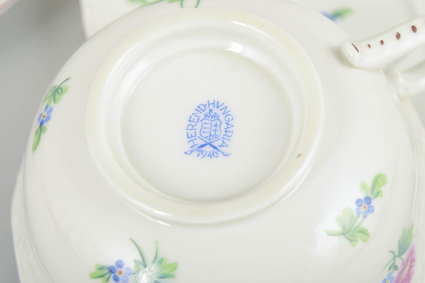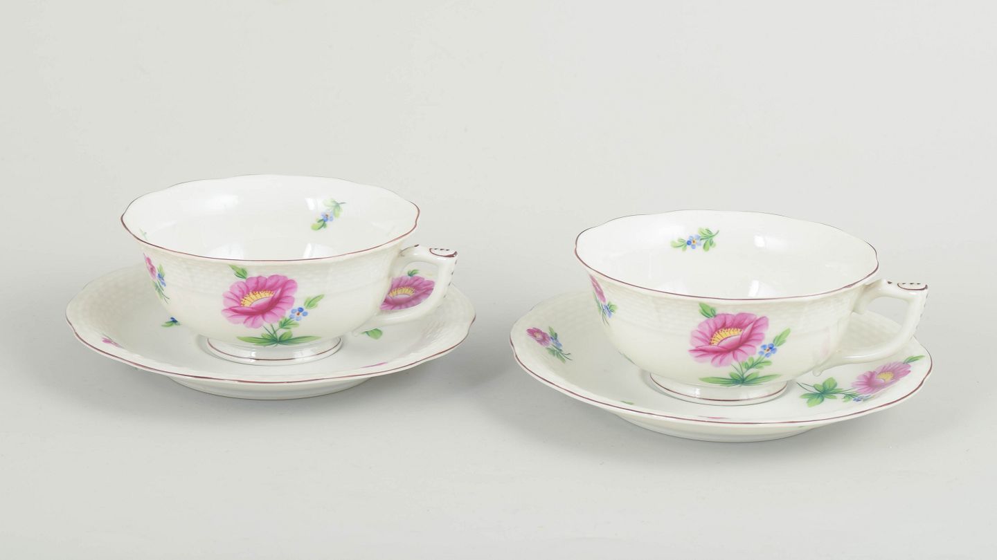 Sæt bestående af to håndmalede tekopper med matchende underkopper i porcelæn fra Herend. Dekoreret med naturalistiske blomster i rosa og blå nuancer samt fine grønne blade. Fabriksmærket i blåt under bunden.