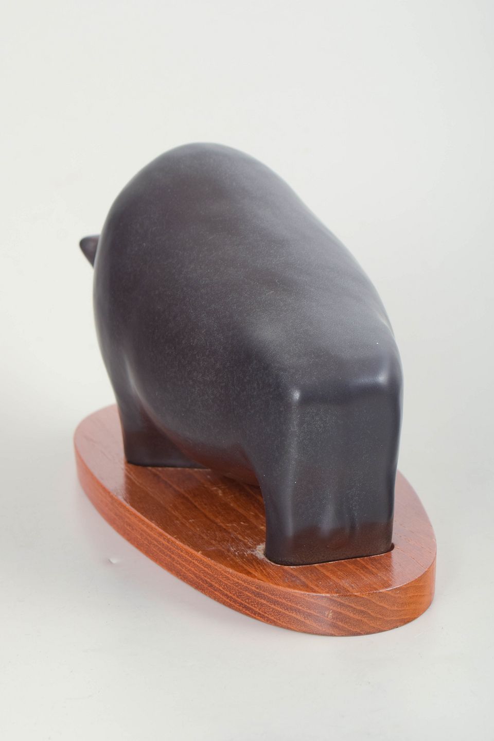 Kraftfuldt udformet tyr i mørk, matglaseret stentøj med kompakt, stiliseret form og markant volumen. Figuren er monteret på en oval træfod og fremstår med en enkel og modernistisk formgivning typisk for Rörstrands produktion i midten af det 20. århundrede. Første sortering.