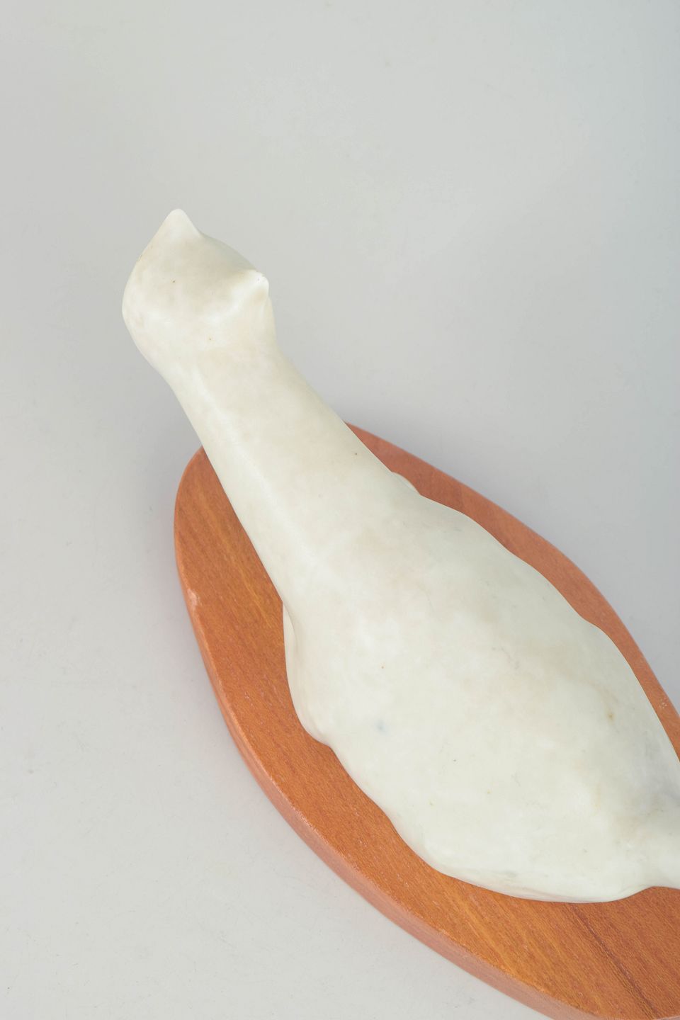 Naturalistisk udformet kat i hvidt stentøj med stiliseret, langstrakt krop og løftet hale. Figuren står på en oval træfod og fremstår med enkel, modernistisk formgivning karakteristisk for Rörstrands produktion i midten af det 20. århundrede.