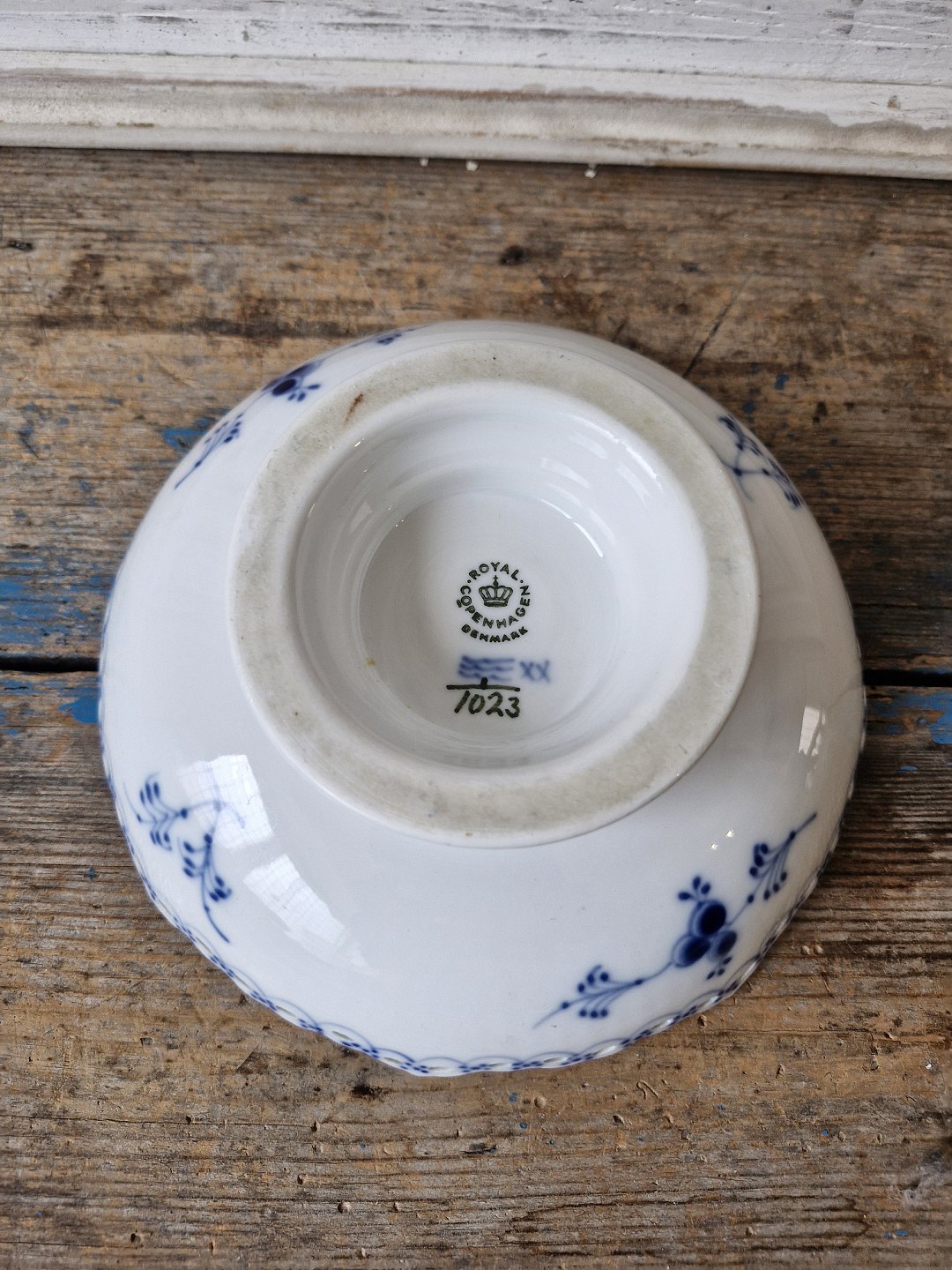 Text zugänglich auf Dänische: Royal Copenhagen Musselmalet helblonde skål på lav fod no. 1023