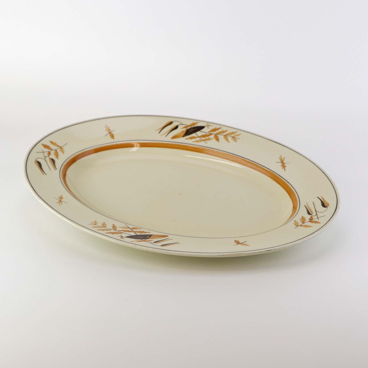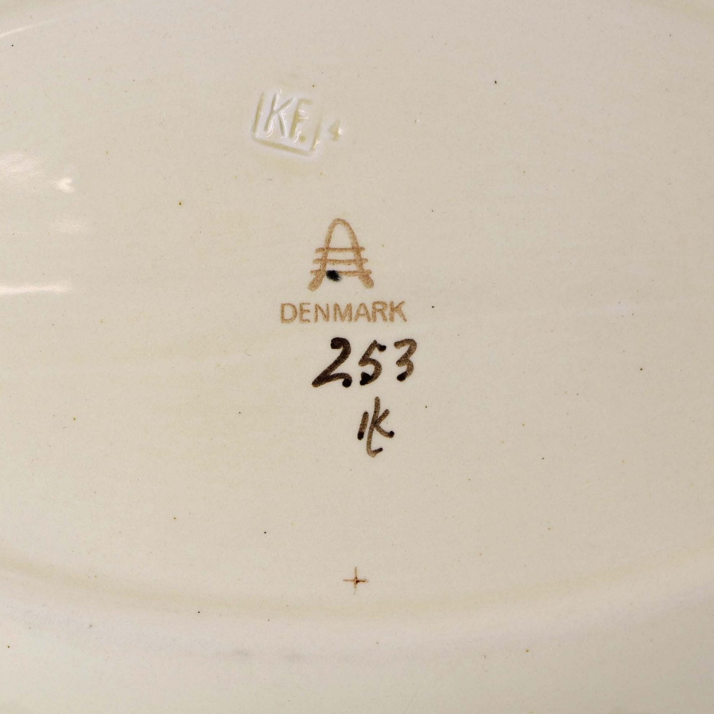 Lille ovalt serveringsfad i fajance fra stellet Åkjær, som blev fremstillet i perioden 1934-1939. Nr. 253
