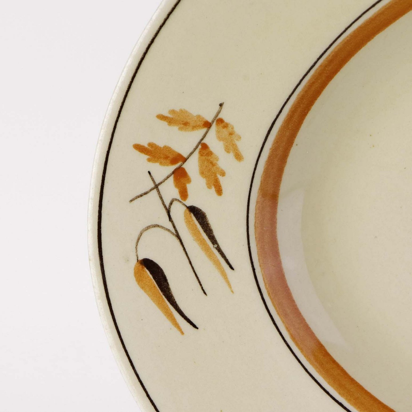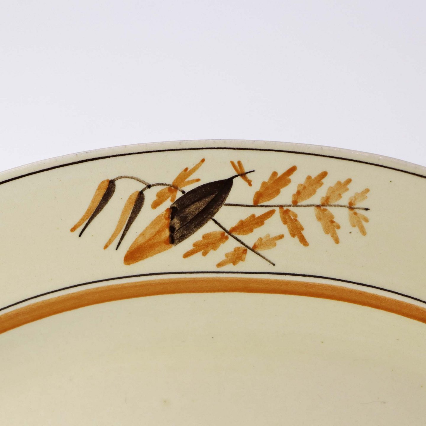 Fajancestel i stelform E med dekoration af egetræsblade og kornaks i brun og orange farve på gul baggrund.