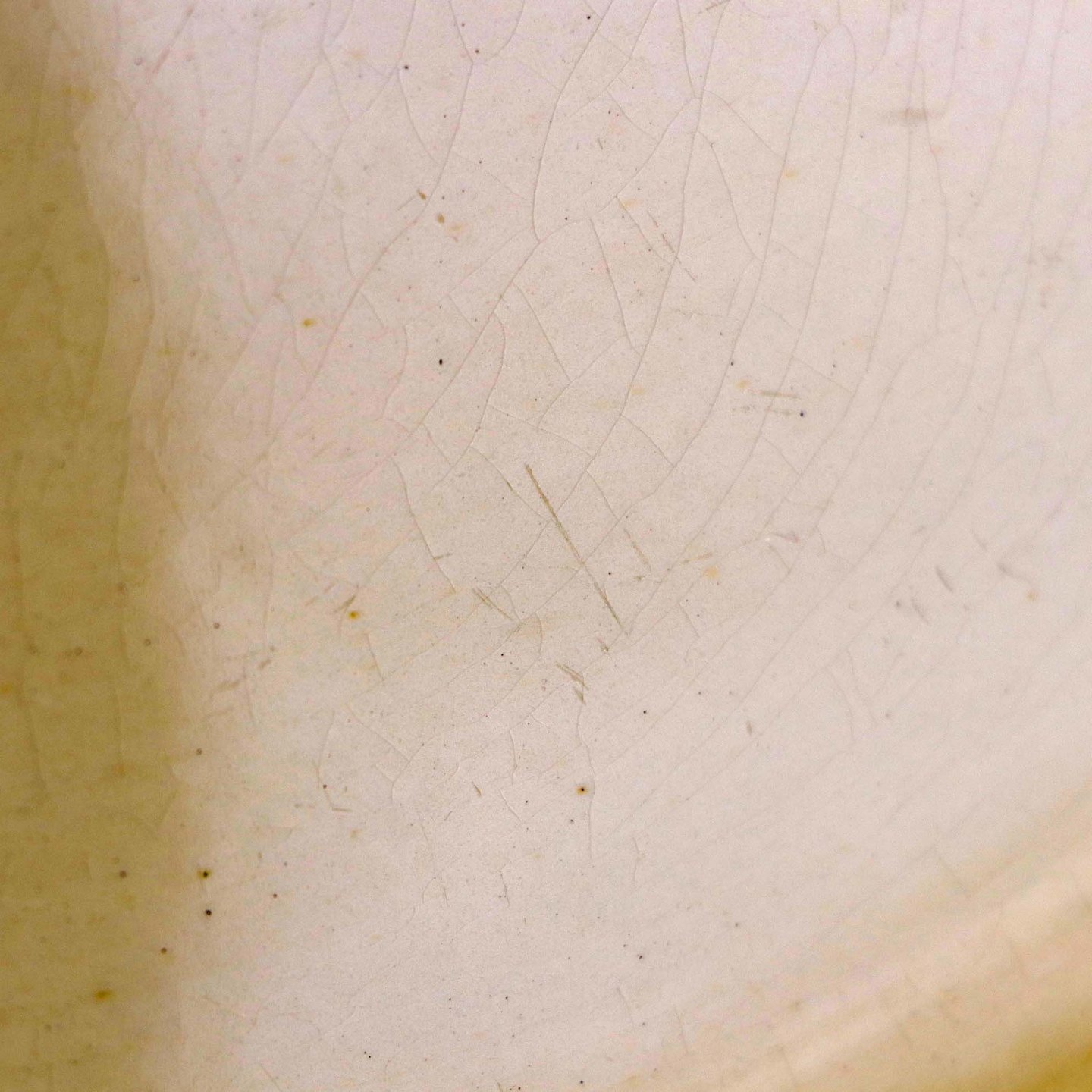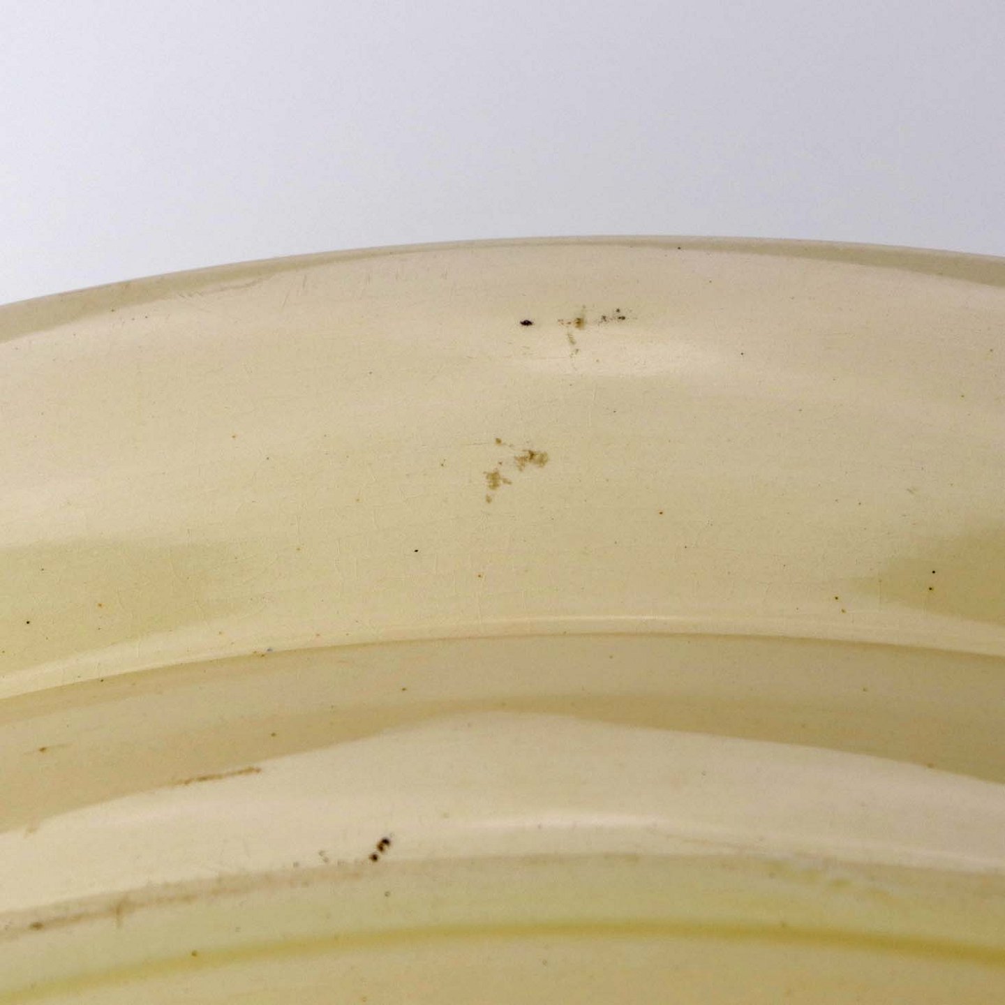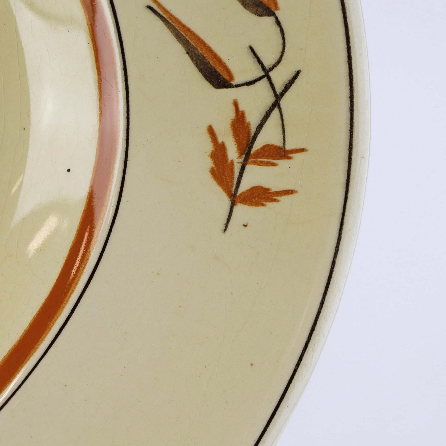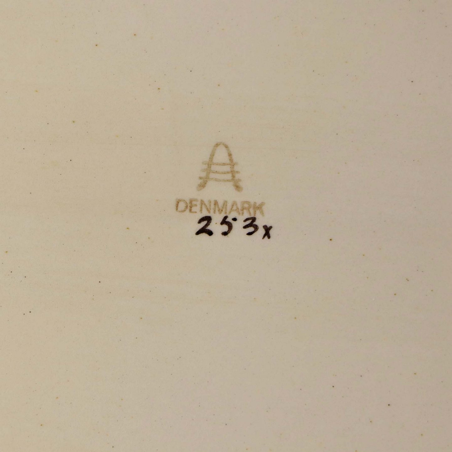 Fremstår med krakkeleringer og nister i glasuren samt brugsspor på baggrunden.