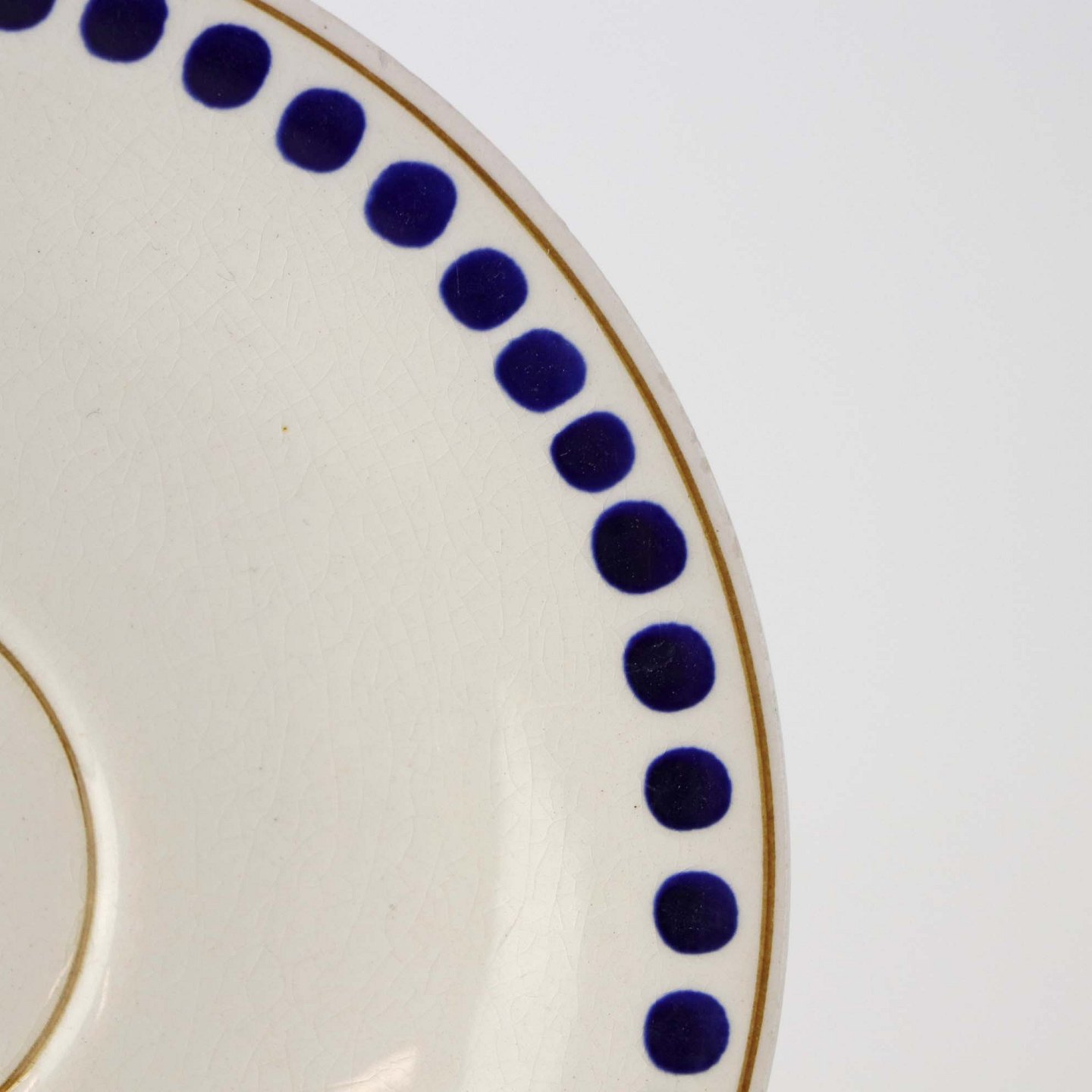 Fajancestel med dekoration af ranker af blåregn og blade på lys baggrund afsluttet med kant af runde blå pletter.