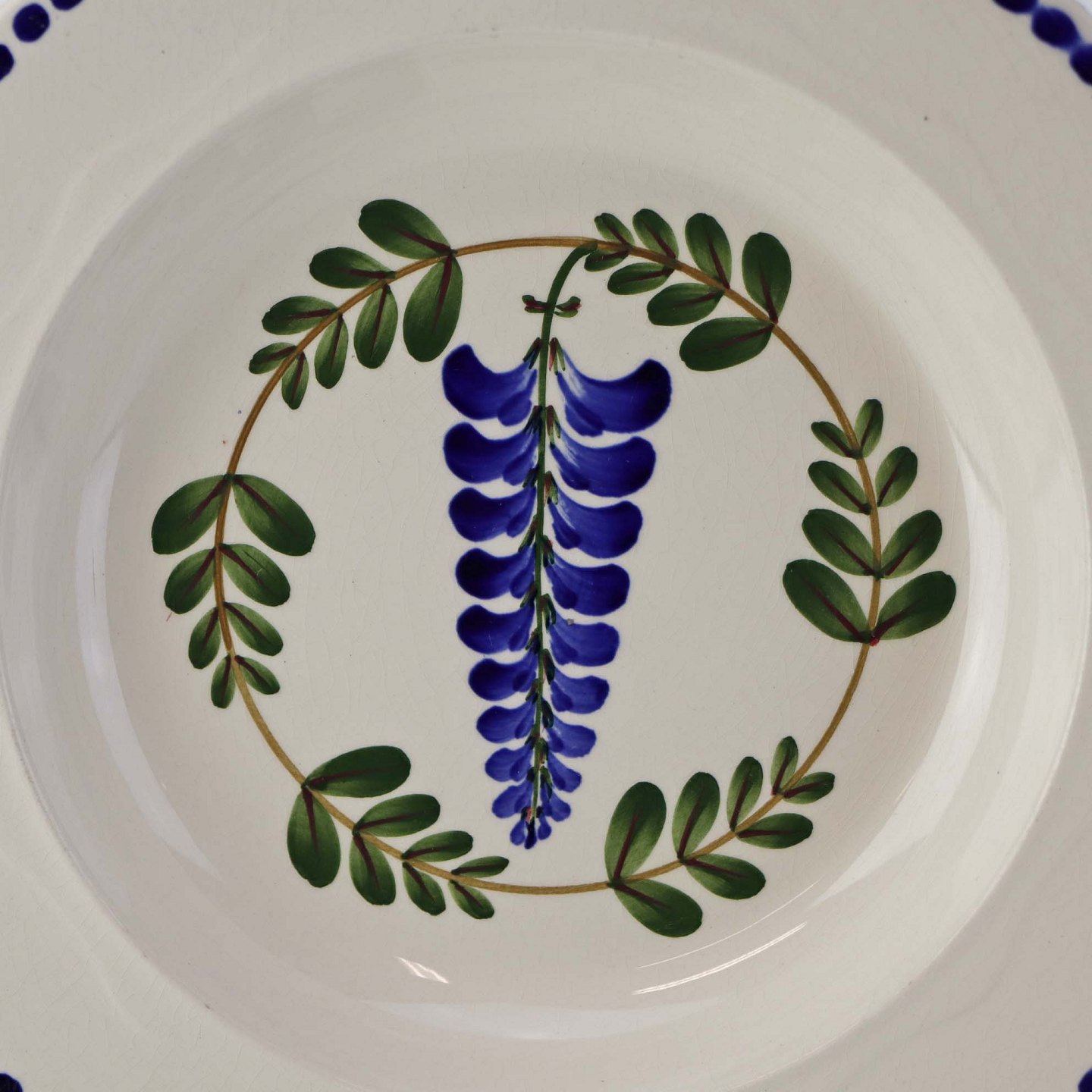Fajancestel med dekoration af ranker af blåregn og blade på lys baggrund afsluttet med kant af runde blå pletter.