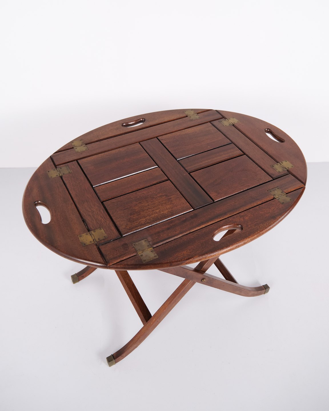 Butlertisch aus den 1940er Jahren aus Mahagoni mit Messingbeschlägen. Klassischer Serviertisch mit abnehmbarem Tablett und elegantem Design.