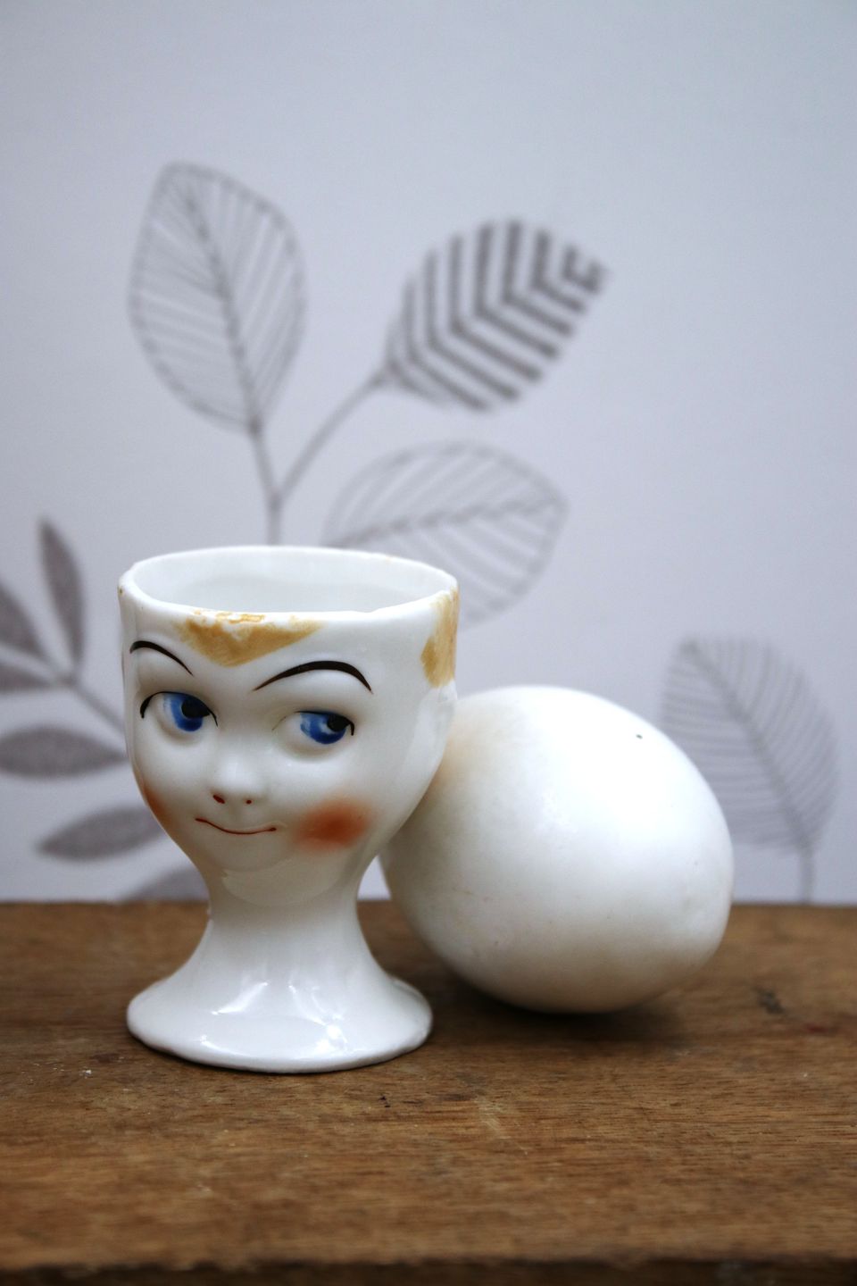 Gammelt æggebægre fra 30érne i porcelæn med bemalet sjovt ansigt.
