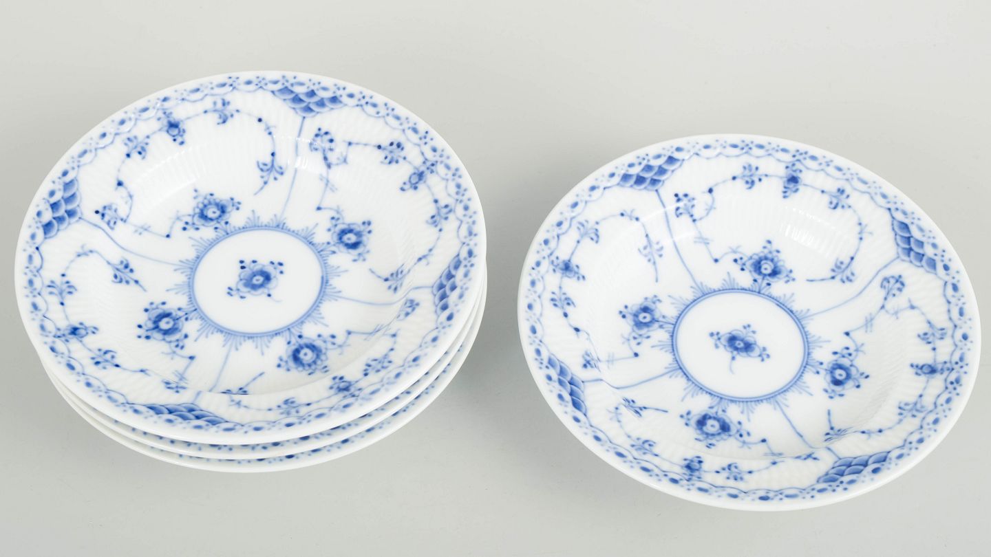 Text zugänglich auf Dänische: Royal Copenhagen Musselmalet Halvblonde, sæt af fire små dybe tallerkener.
