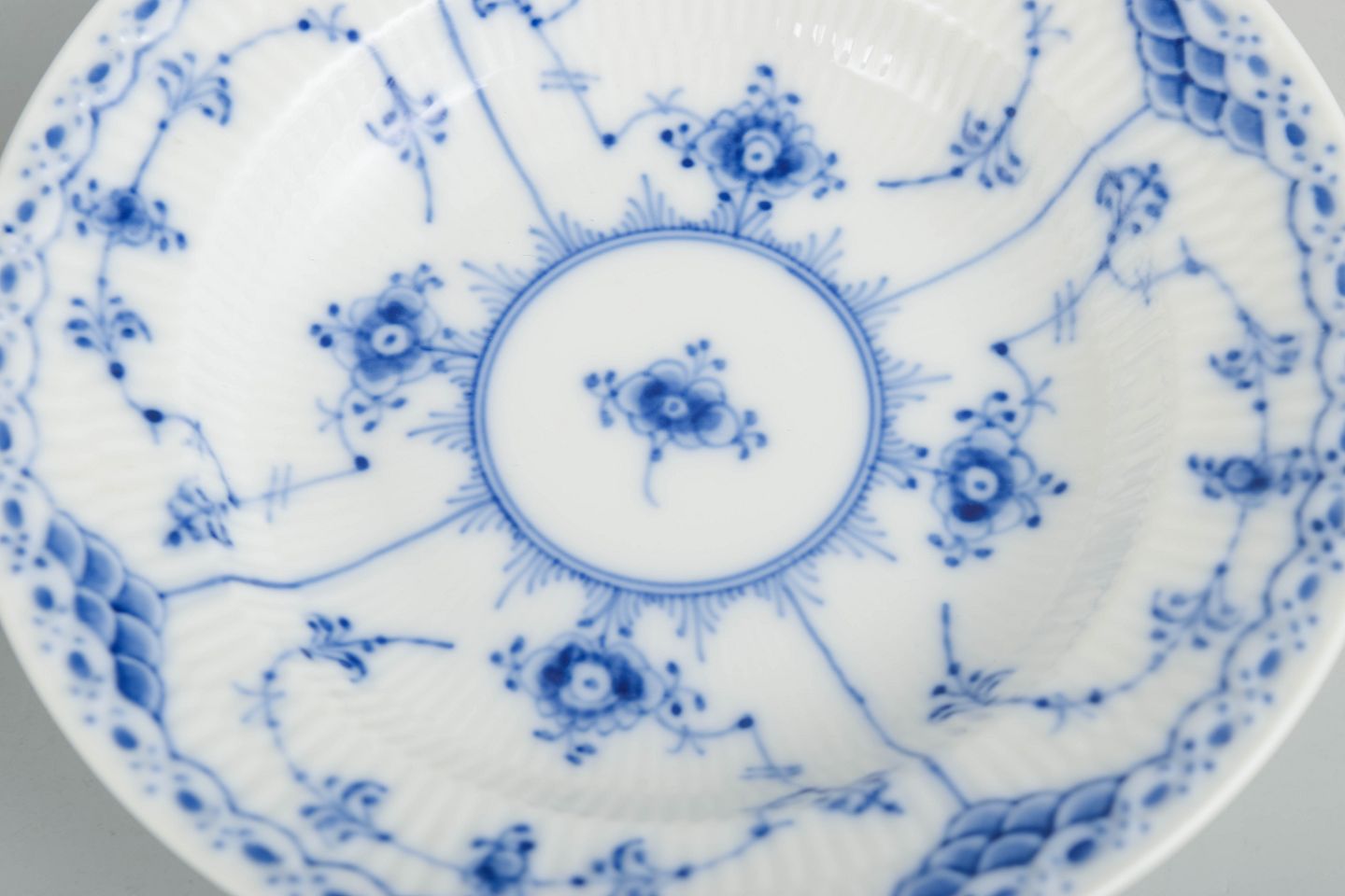 Royal Copenhagen blev grundlagt i 1775 i København under kongelig bevilling. Fabrikken er internationalt anerkendt for sit håndmalede porcelæn og sit høje kunstneriske niveau. Musselmalet Halvblonde er en variation af det klassiske Musselmalet stel og kombinerer riflede flader med en dekorativ blondekant, udført med stor håndværksmæssig præcision.