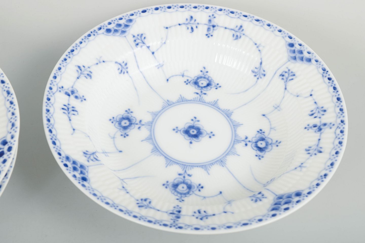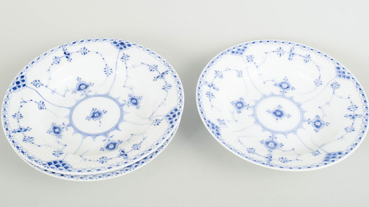 Sæt af tre dybe tallerkener i håndmalet porcelæn fra Musselmalet Halvblonde med klassisk underglasurdekoration i koboltblå, riflede felter og karakteristisk blondekant. Model 1/566. Annulleret med én indridset streg under bunden.