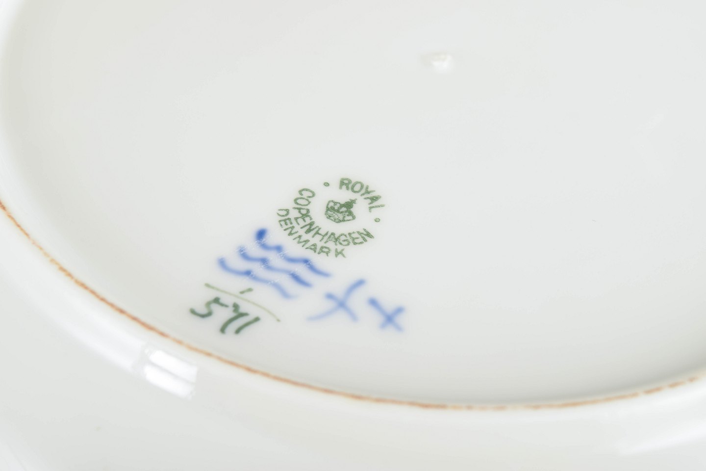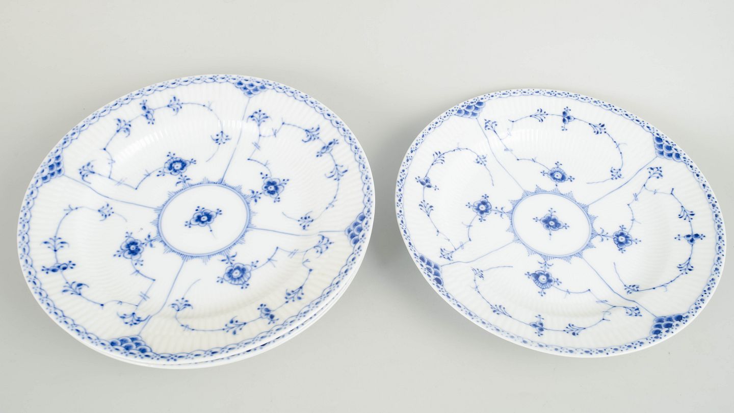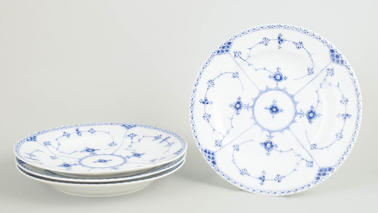 Text zugänglich auf Dänische: Royal Copenhagen Musselmalet Halvblonde, sæt af fire middagstallerkener.