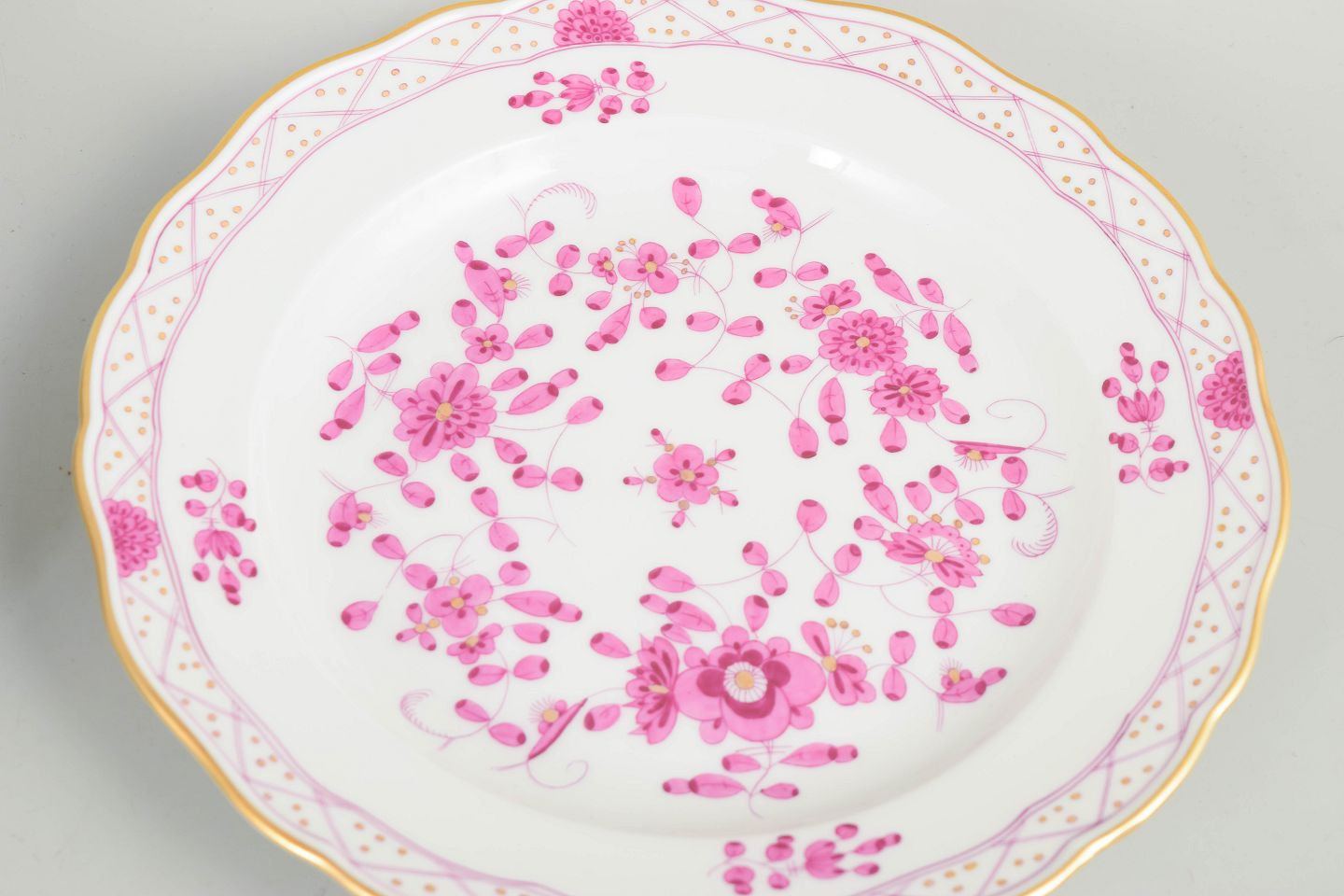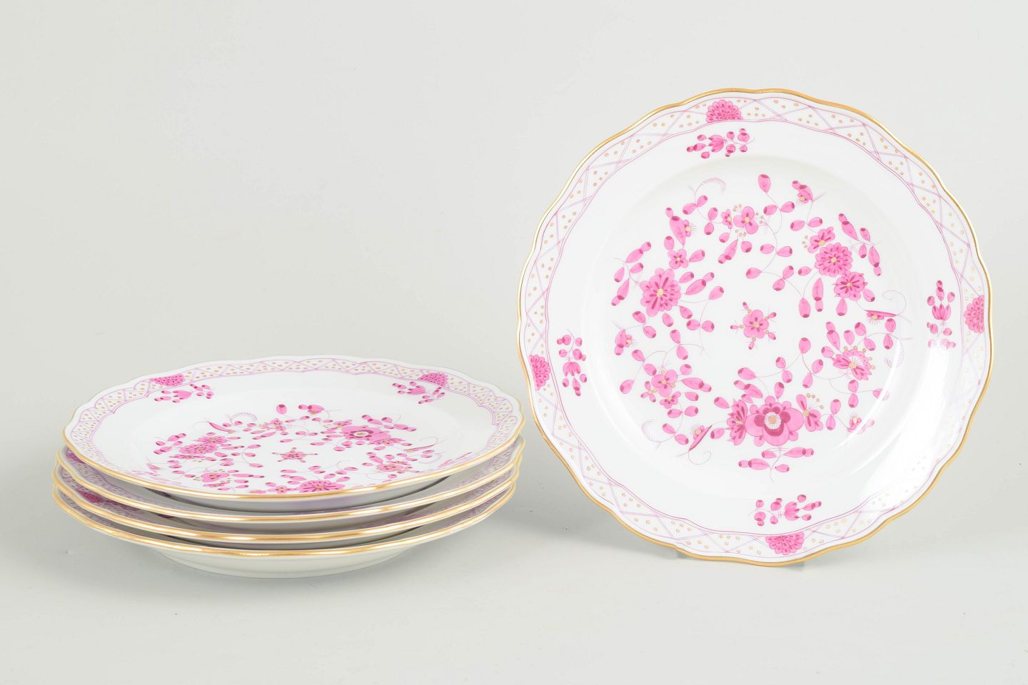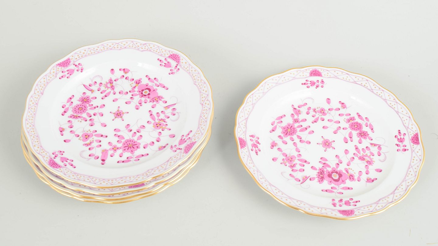 Text zugänglich auf Dänische: Meissen, "Pink Indian" sæt af fem frokosttallerkener.