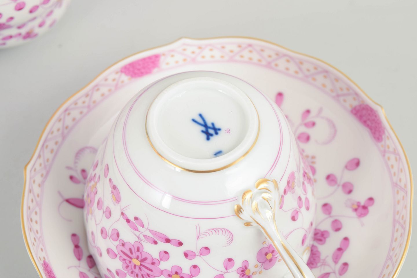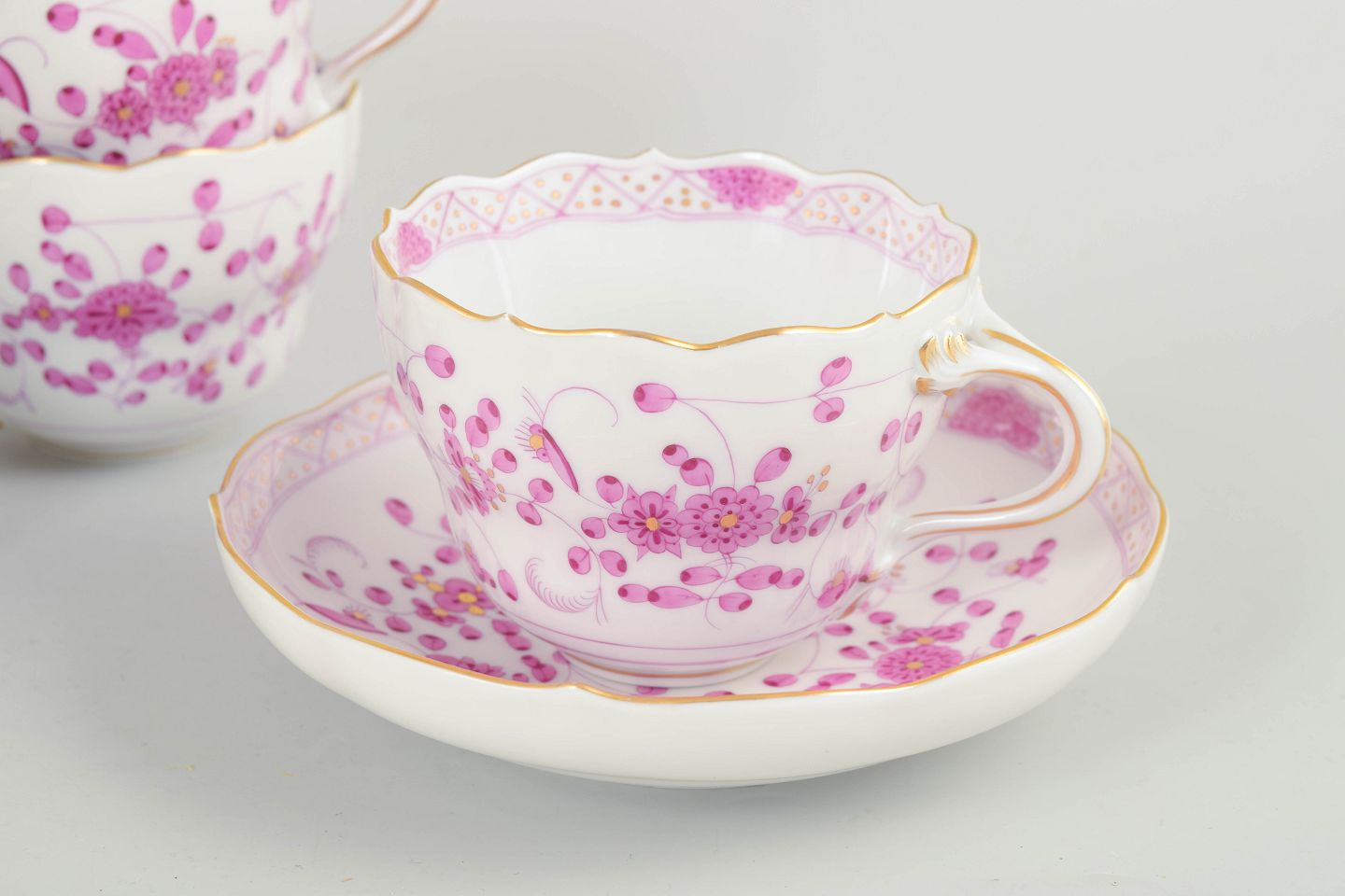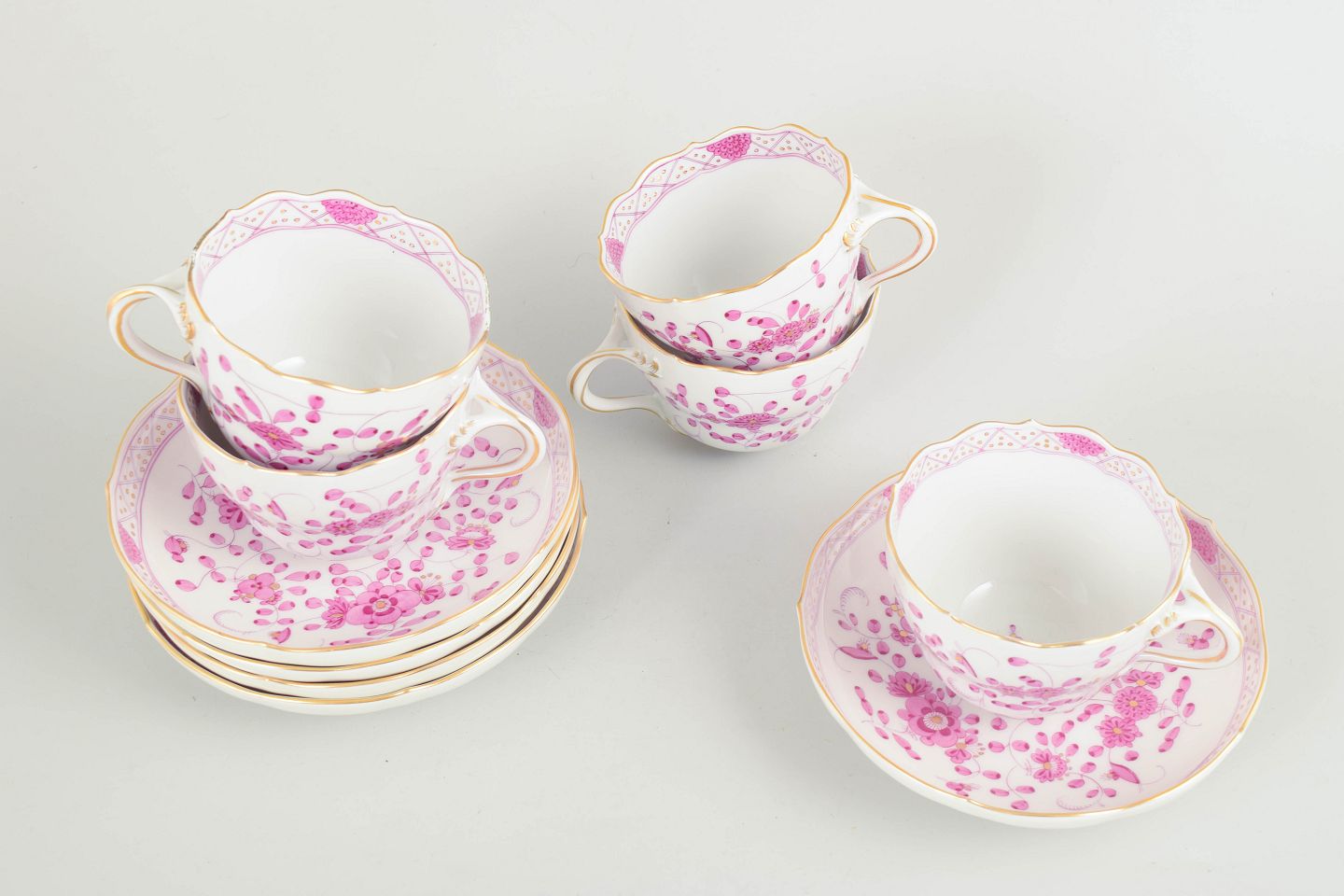 Text zugänglich auf Dänische: Meissen, "Pink Indian" sæt af fem store kaffekopper med underkopper.