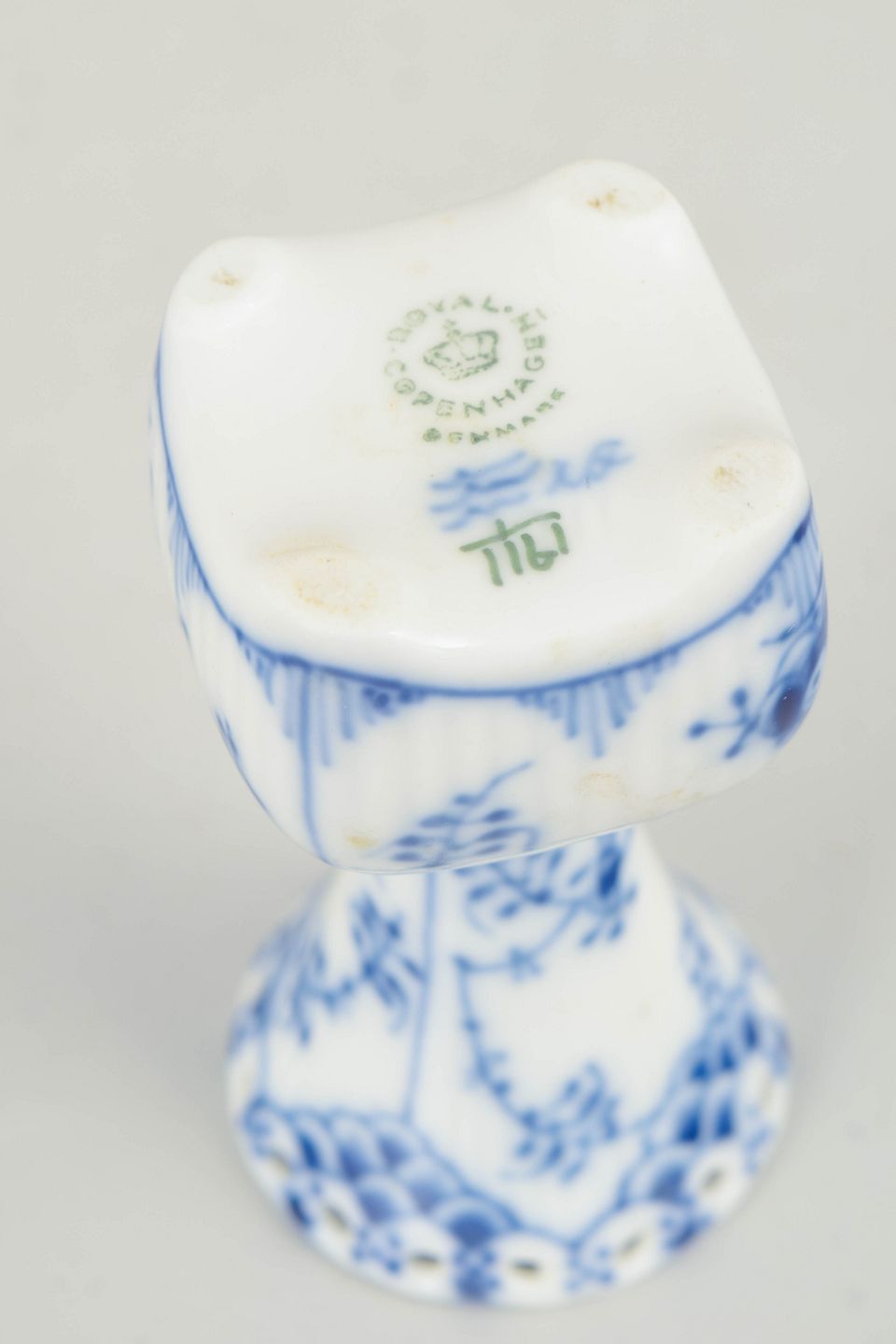 Lille vase i håndmalet porcelæn fra Musselmalet Helblonde med klassisk underglasurdekoration i koboltblå og gennembrudt blondekant.
