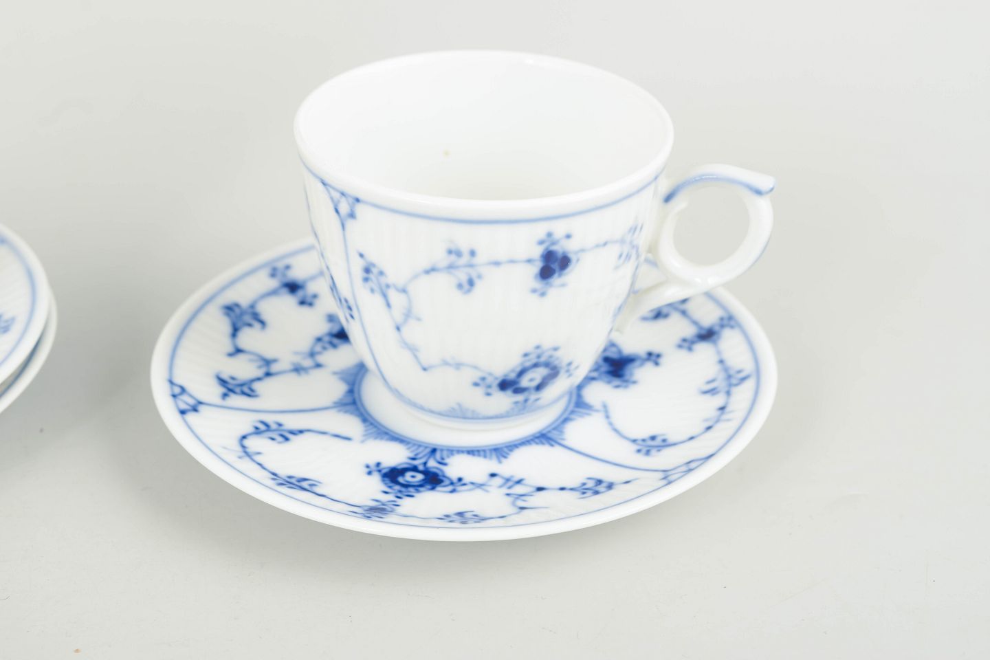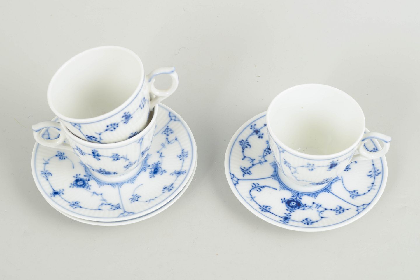 Sæt af tre mokkakopper med tilhørende underkopper i håndmalet porcelæn fra Musselmalet Riflet med klassisk underglasurdekoration i koboltblå.