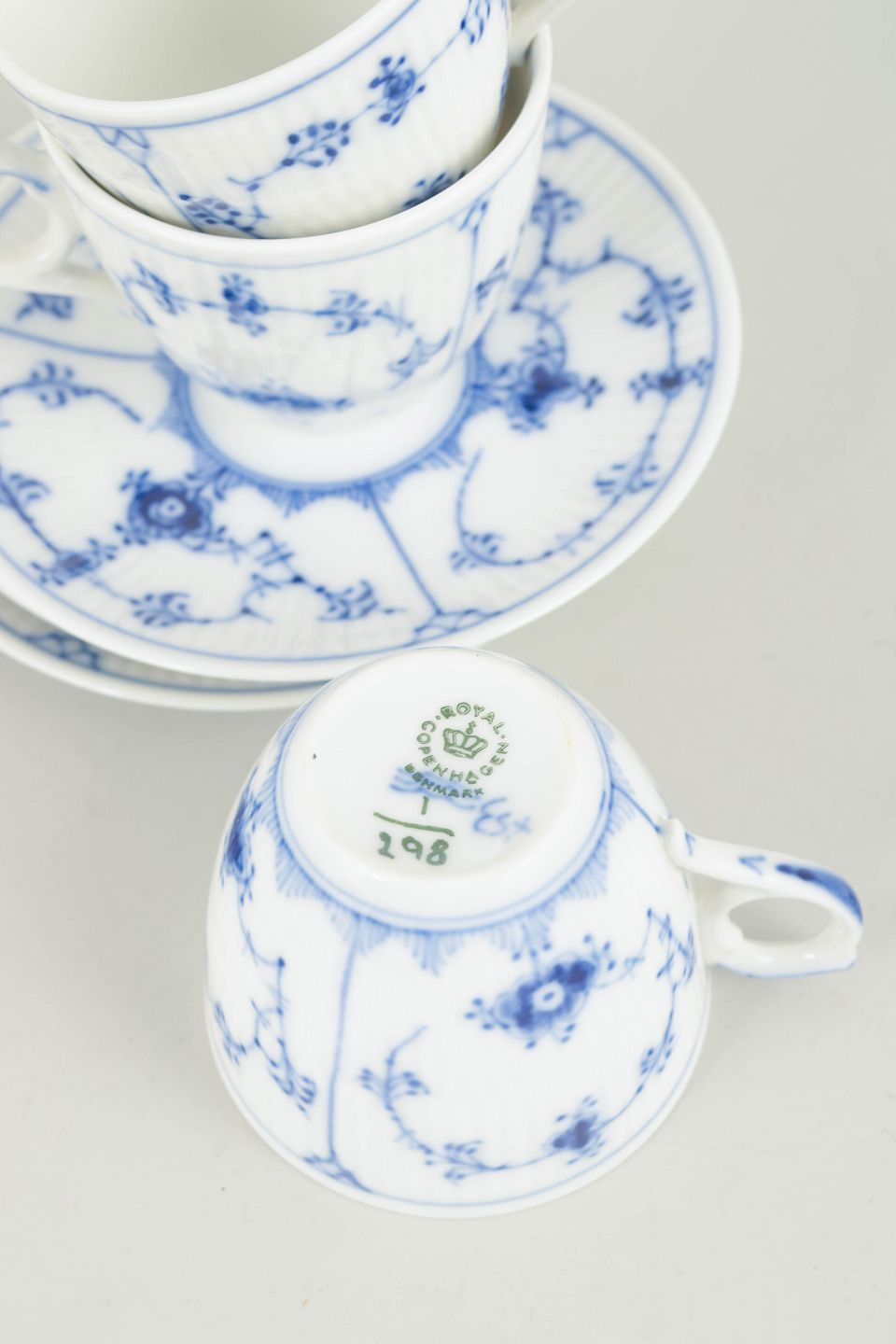 Text zugänglich auf Dänische: Royal Copenhagen Musselmalet Riflet, sæt af tre mokkakopper med underkopper.