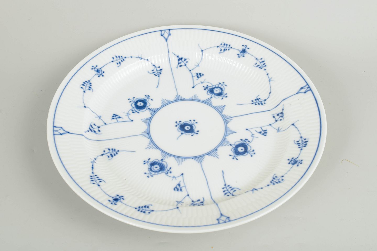 Stort rundt fad i håndmalet porcelæn fra Musselmalet Riflet med klassisk underglasurdekoration i koboltblå. Model 1/107. Første sortering. Fremstillet i 1970’erne.