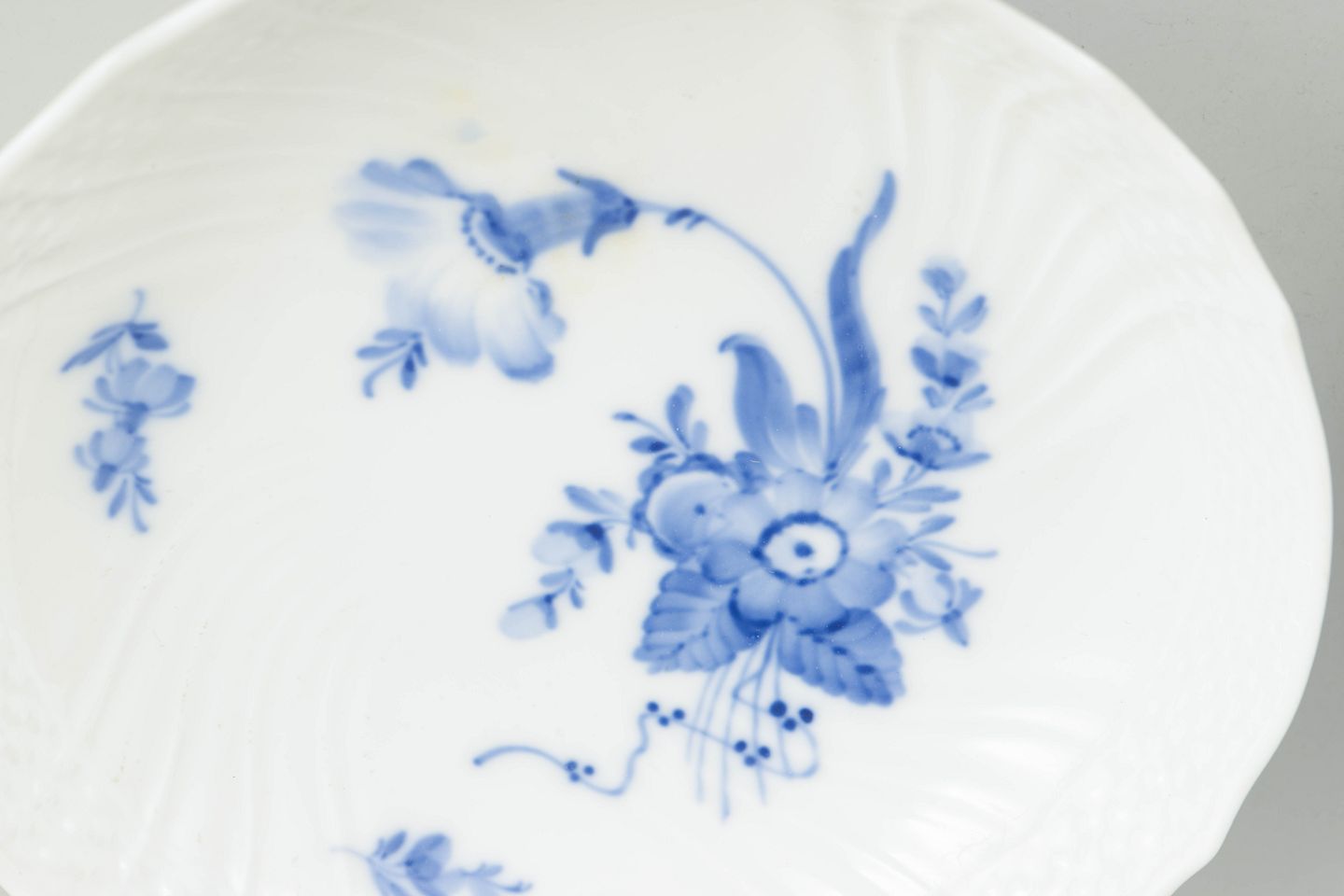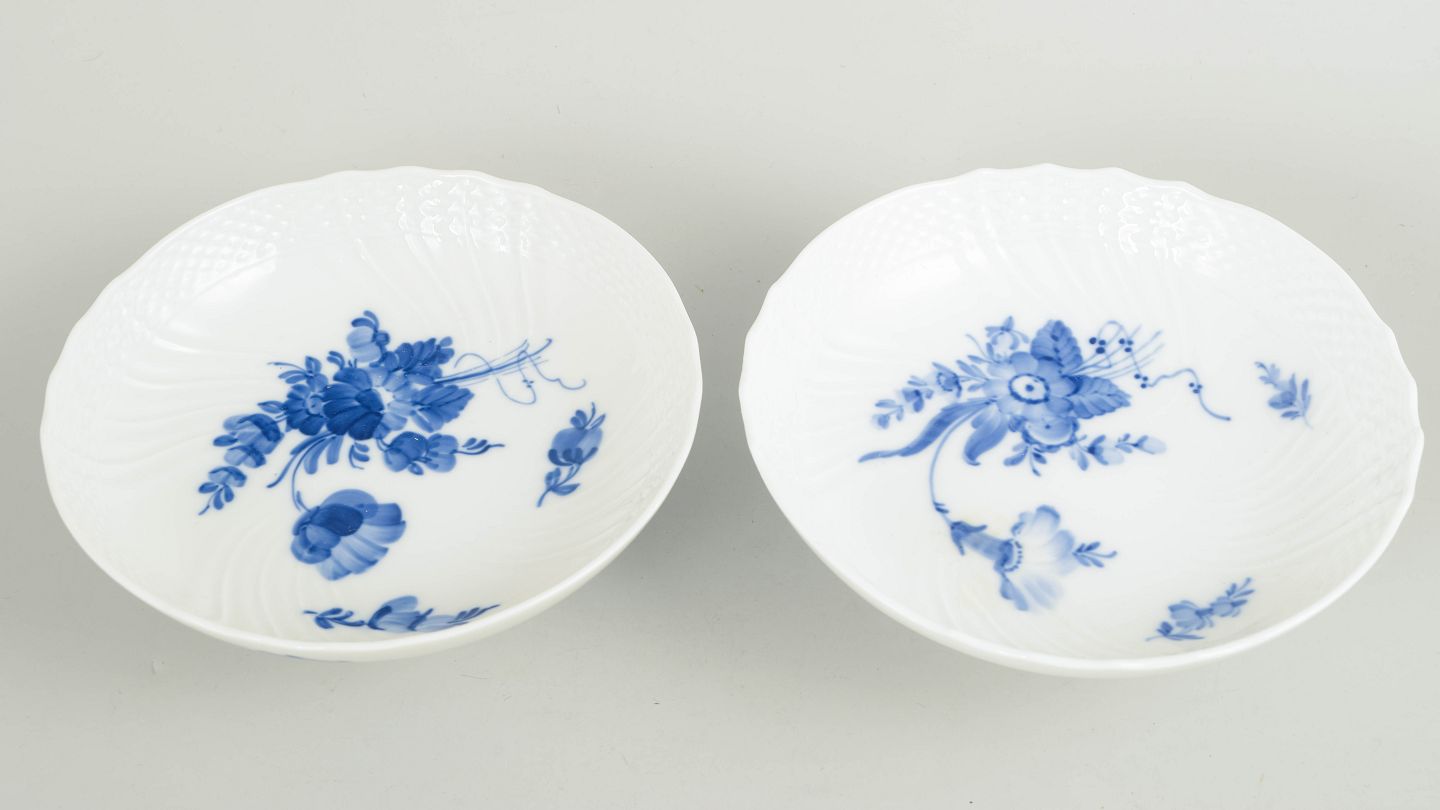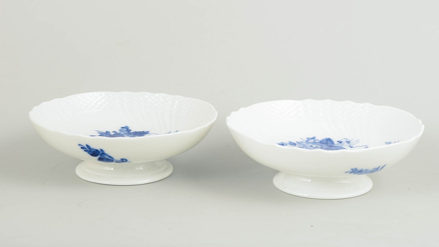 Sæt af to små opsatsskåle i håndmalet porcelæn fra Blå Blomst Svejfet med klassisk underglasurdekoration i koboltblå med naturalistisk blomstermotiv og svejfet form. Model 10/1532. Første sortering. Fremstillet i 1961.