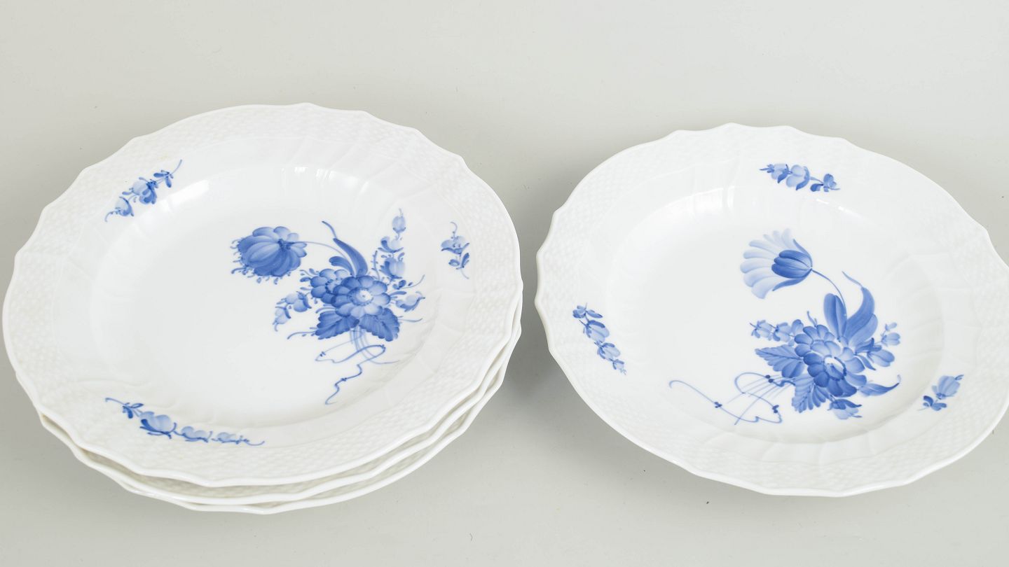 Royal Copenhagen Blå Blomst Svejfet, sæt af fire middagstallerkener.