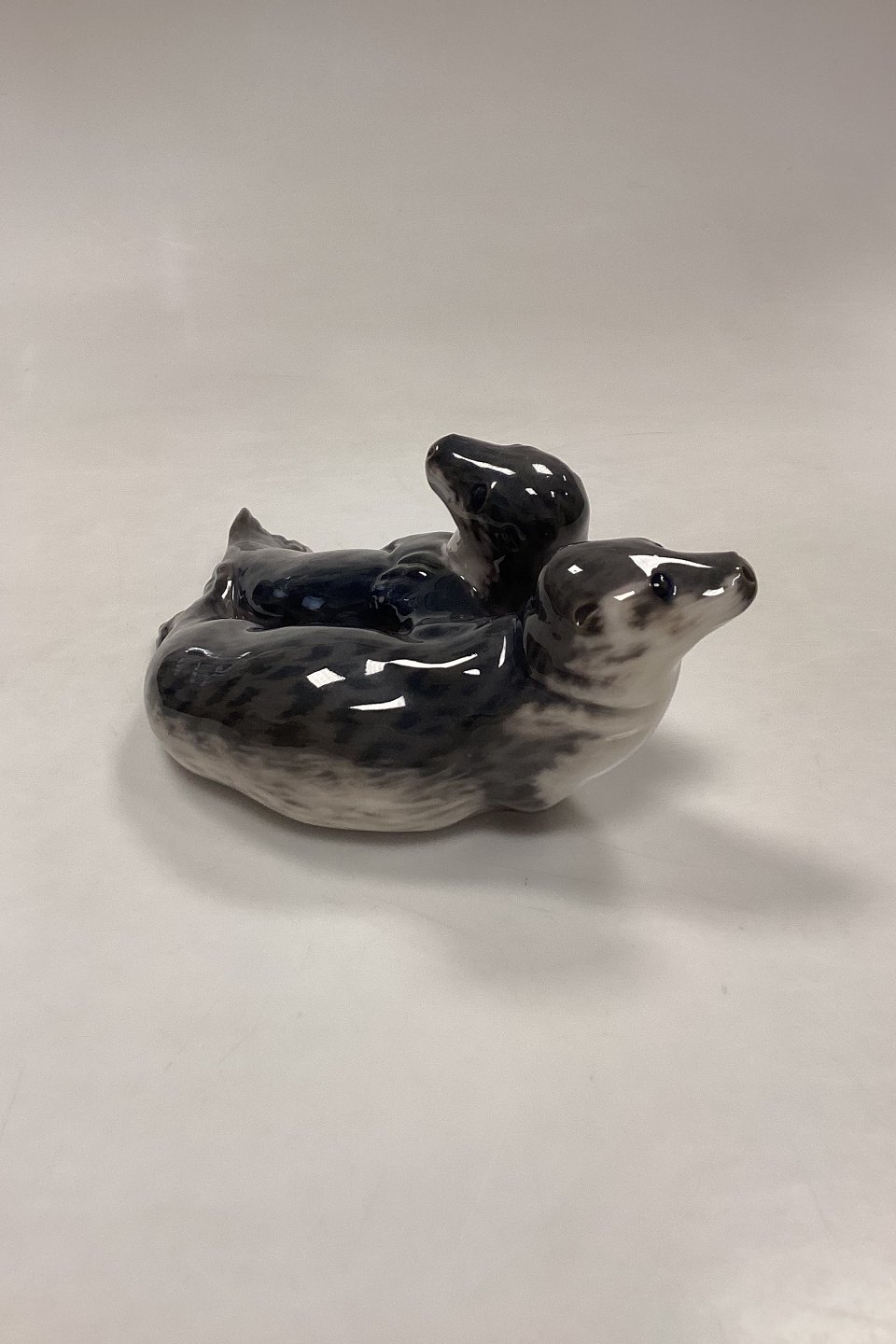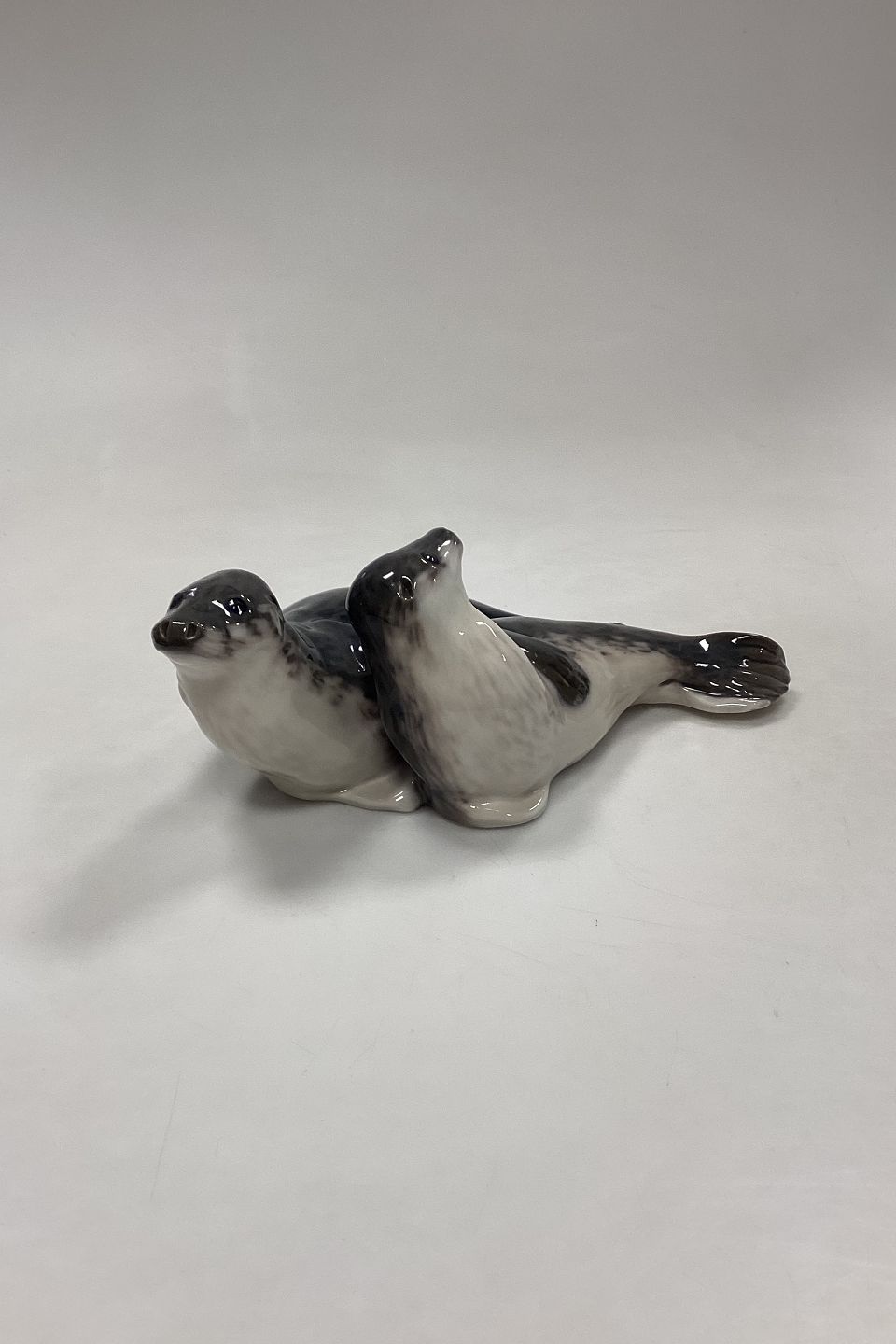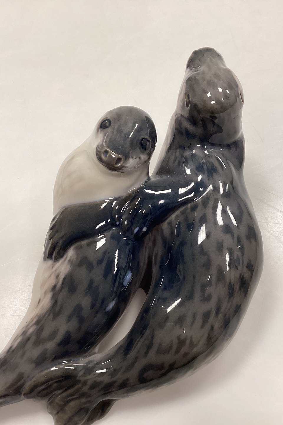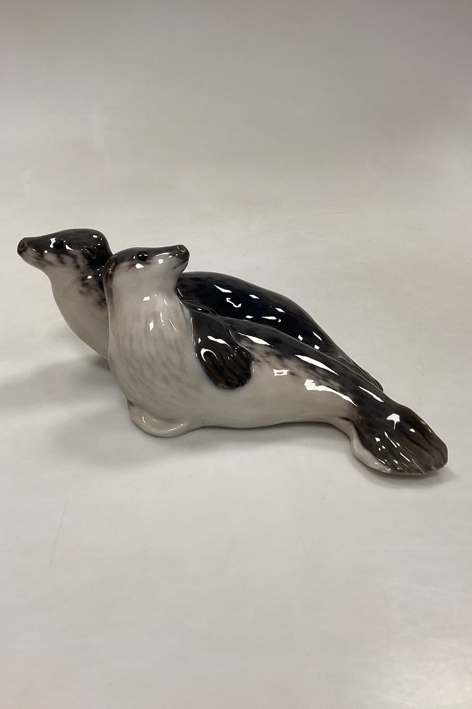 Royal Copenhagen Figur af Sæler No. 709. Designet af Erik Nielsen i 1906. Afslibninger af glasuren på den ene sæl, se foto. Sjælden figur i 2. Sortering.