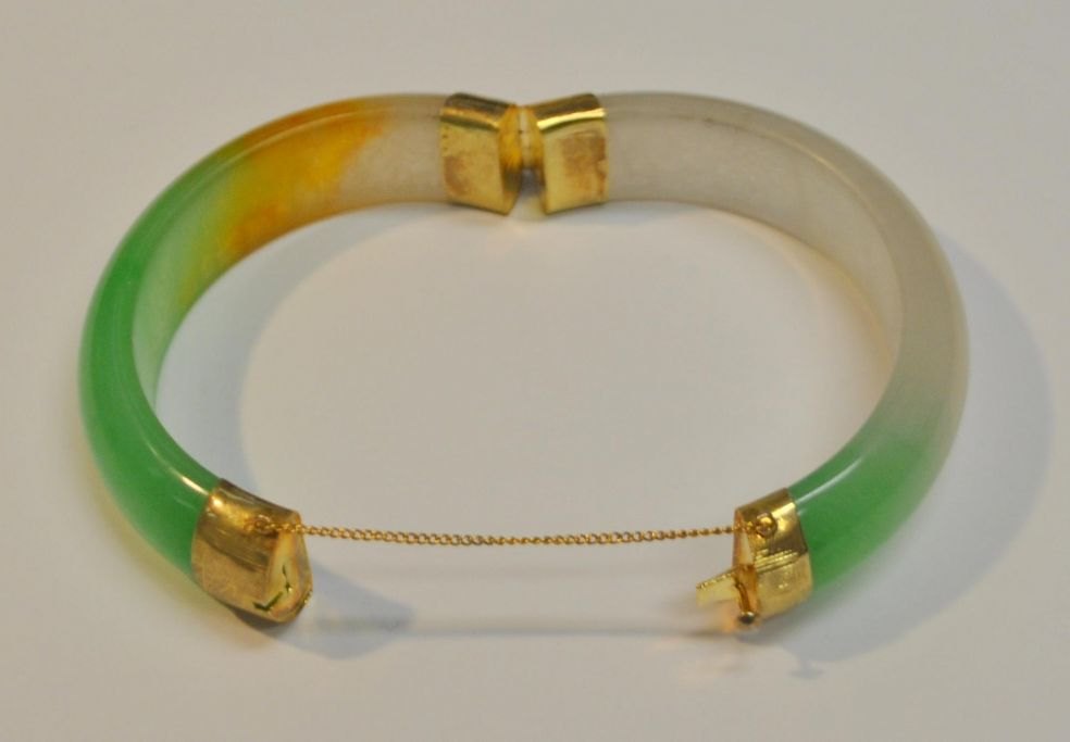 Chinesisches Jade-Armband, 20. Jahrhundert. Mit Verschluss aus 8-karätigem Rotgold. Innendurchmesser: 6,2 cm. Außendurchmesser: 8 cm.