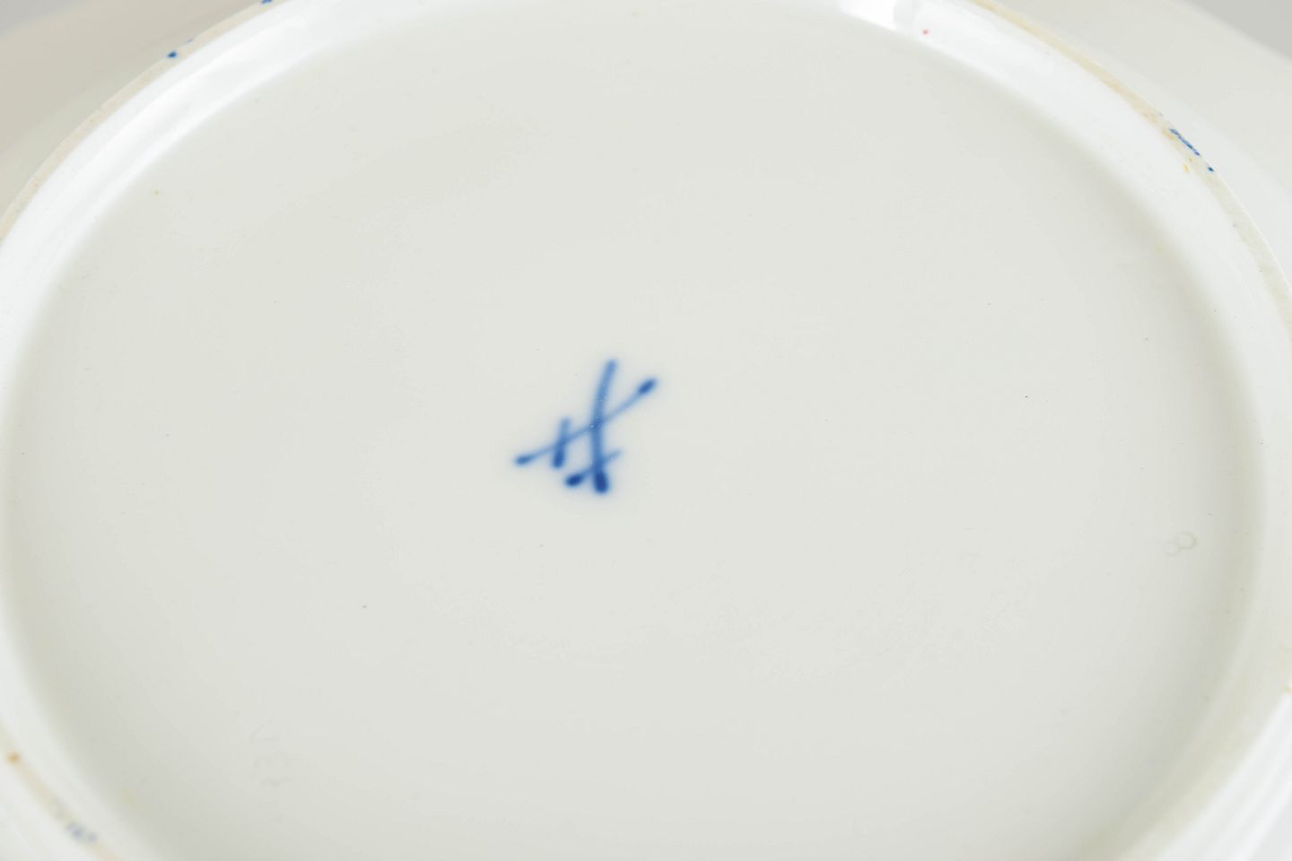 Sæt af tre dybe tallerkener i håndmalet porcelæn med Blå Orkidé dekoration. Fremstillet hos Meissen og mærket med Meissen krydssværd. Annulleret med to indridsede streger under bunden.
