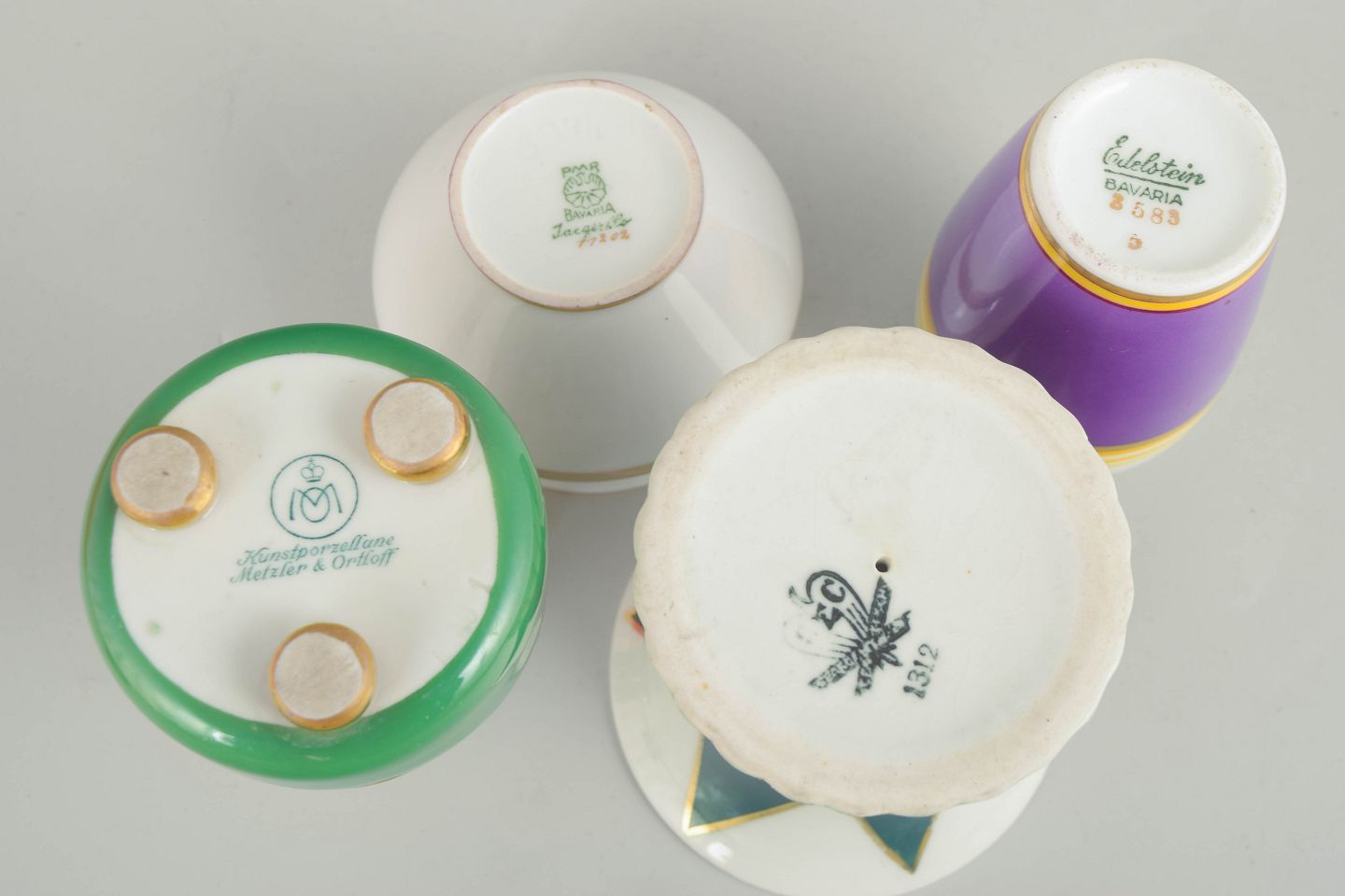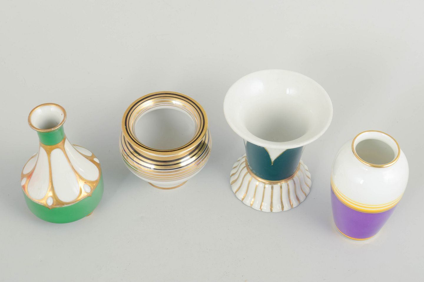 Fire små vaser i porcelæn med klassiske art deco former og dekoration i grønne, hvide og violette nuancer med stafferinger i guld. Vaserne fremstår med elegante proportioner og karakteristisk stil fra tysk porcelænsproduktion i mellemkrigstiden.