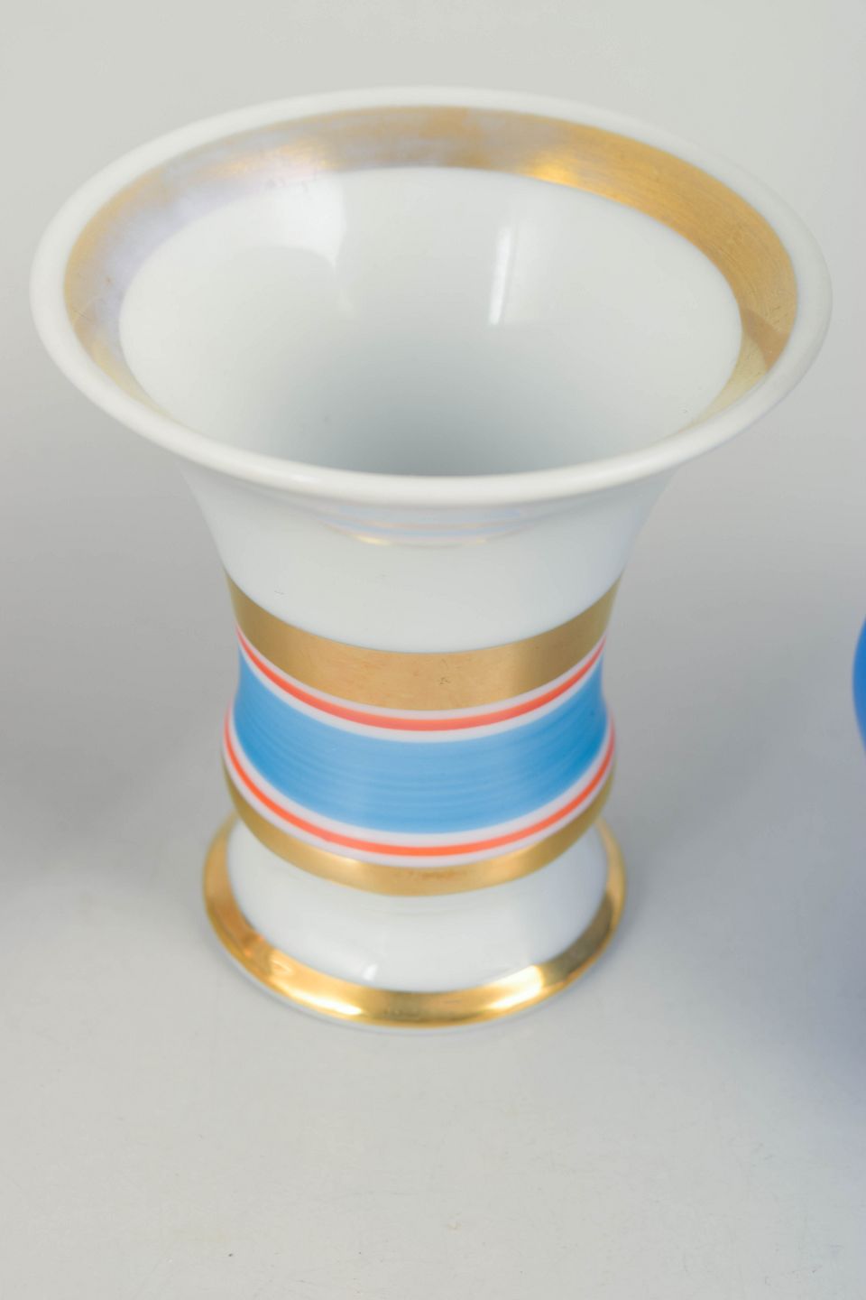 Tysk porcelænsproduktion i art deco-perioden fra 1920’erne og 1930’erne var præget af elegante former og raffineret dekoration, ofte med geometriske linjer og kontrasterende farver. Mange fabrikker fremstillede små dekorative vaser med håndmalede detaljer og guldkant, som i dag er eftertragtede samlerobjekter.