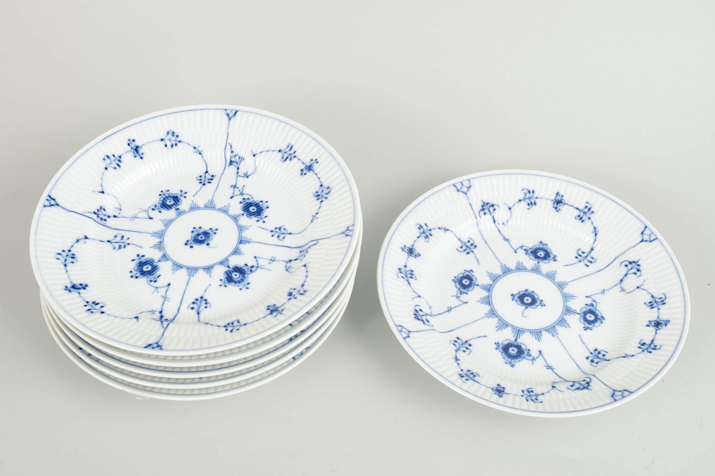 Sæt af seks tallerkener i håndmalet porcelæn fra Musselmalet Riflet med klassisk underglasurdekoration i koboltblå og riflede felter.