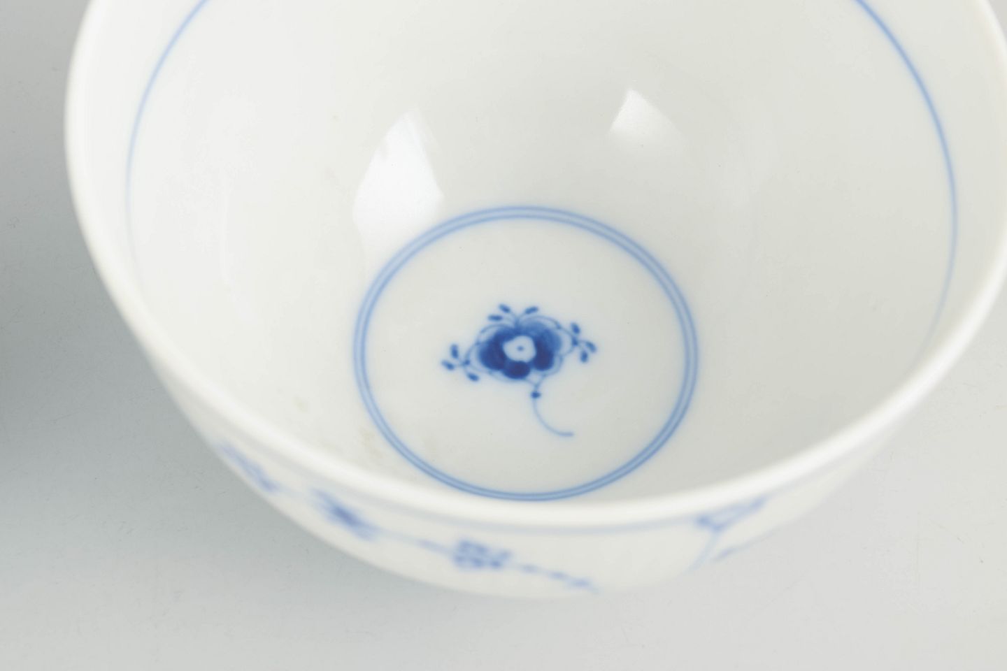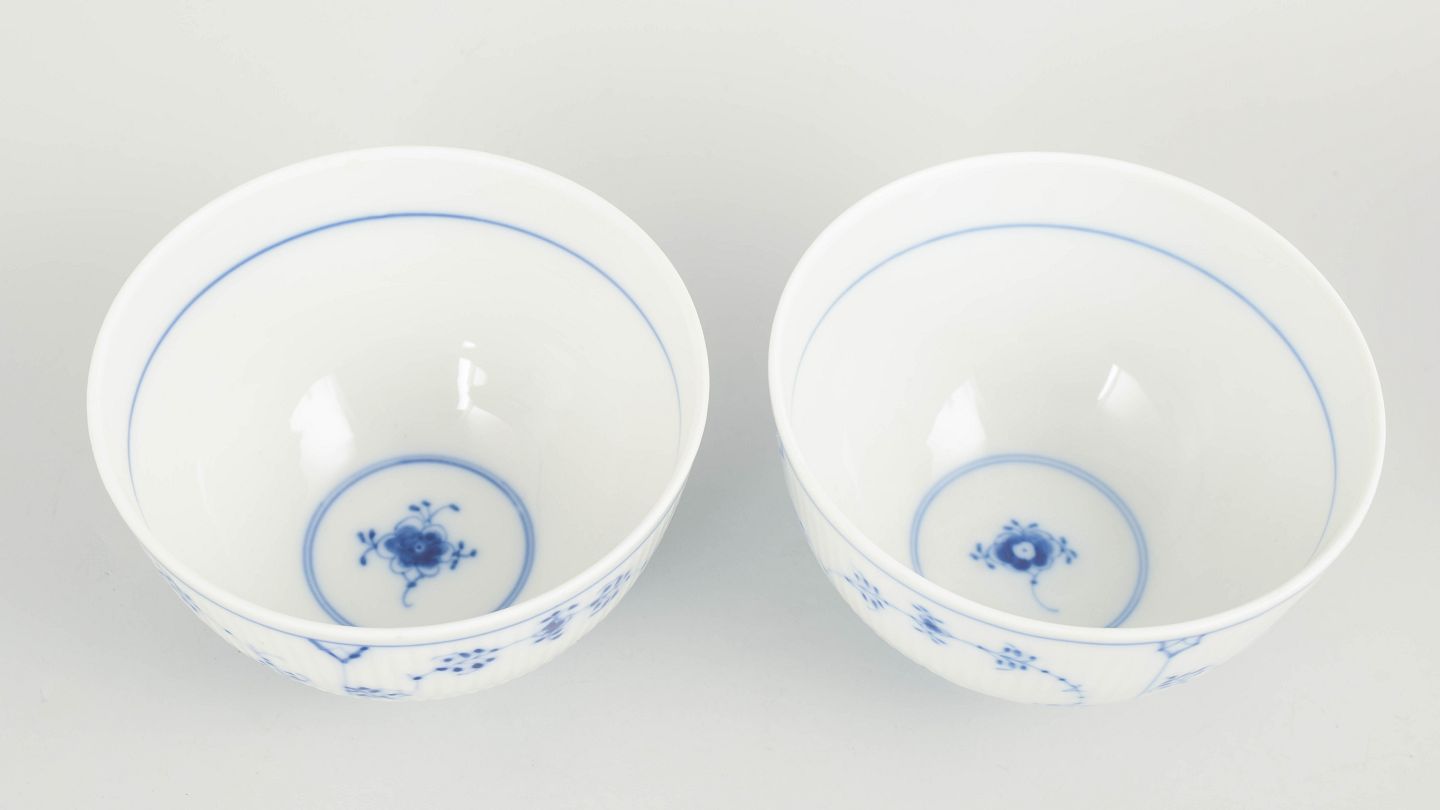 Sæt af to skåle i håndmalet porcelæn fra Musselmalet Riflet med klassisk underglasurdekoration i koboltblå og riflede felter. Model 1/209. H. 7 cm, D. 12 cm. Første sortering. Fremstillet i 1980’erne.
